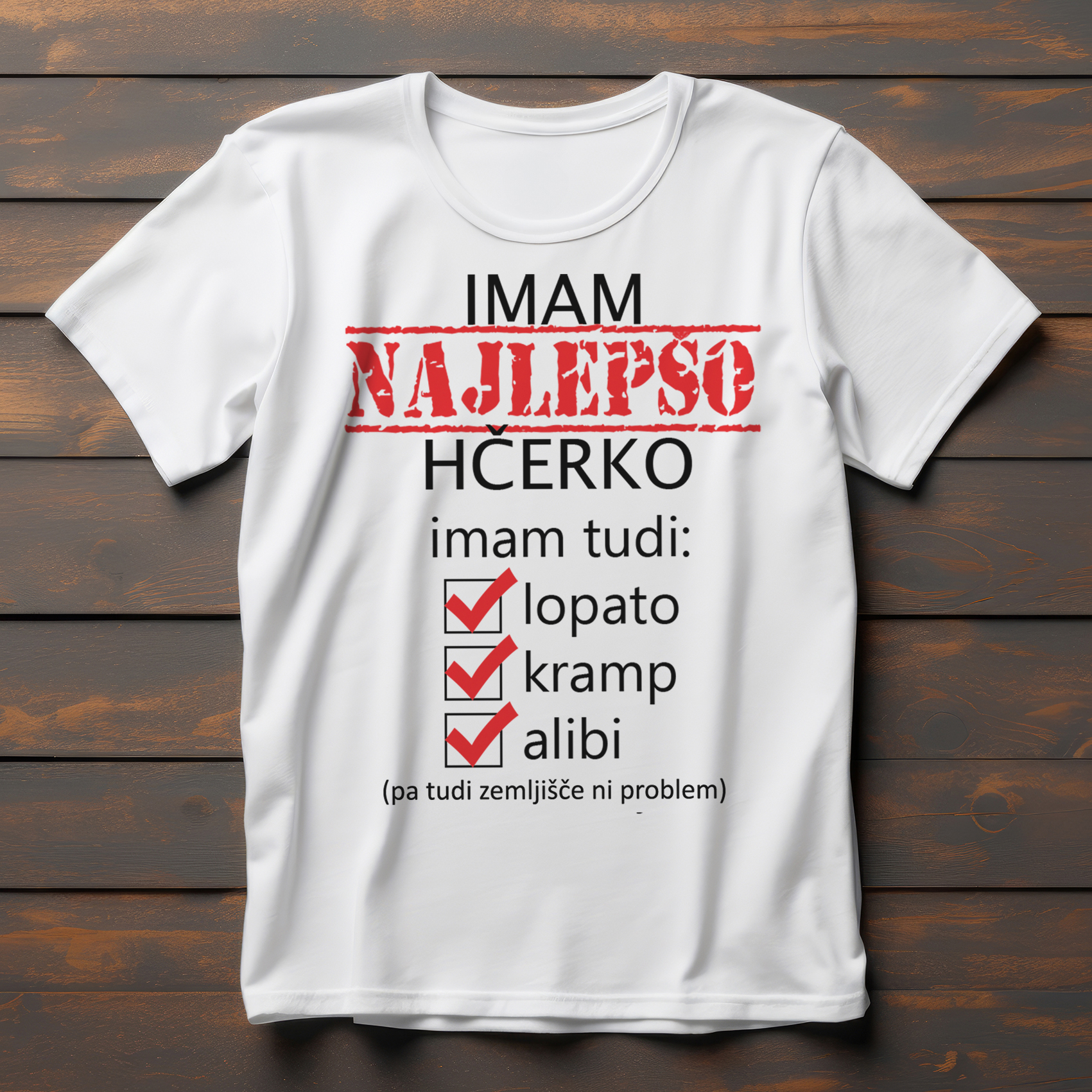 Majica "Imam prelepo hčerko, imam tudi pištolo, lopato in alibi". Pokažite svojo zaščitniško naravo in smisel za humor z našo majico! Ta udobna in stilska majica je idealna za očete, ki želijo z duhovitim sporočilom pritegniti nasmehe. Izdelana iz kakovostnega, zračnega materiala, je popolna za vsakodnevno nošenje ali sproščene priložnosti.