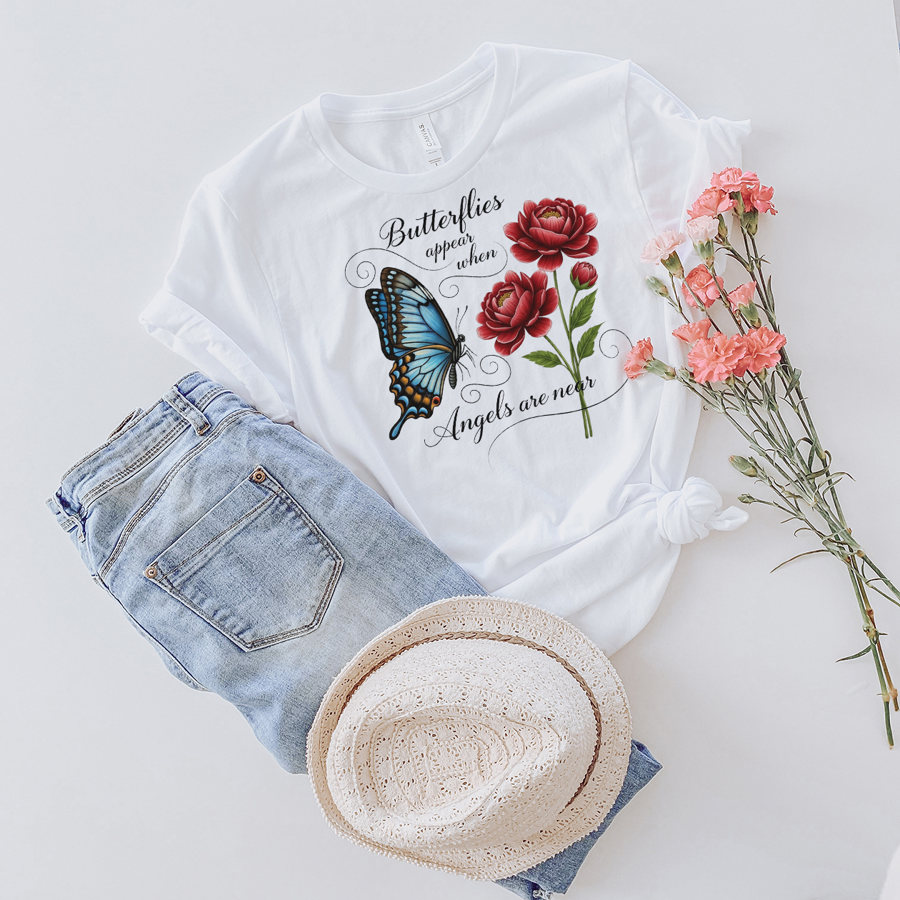 Majica z nežnim in čarobnim angleškim napisom "Butterflies appear when angels are near", obdanem z romantično grafiko: čudovite vrtnice v polnem cvetu in velik, prelep moder metulj, ki nežno lebdi med njimi. Ta dizajn prinaša občutek angelske prisotnosti, zaščite in duhovne povezave – metulj simbolizira duše ali angele, vrtnice pa ljubezen, lepoto in spomin.