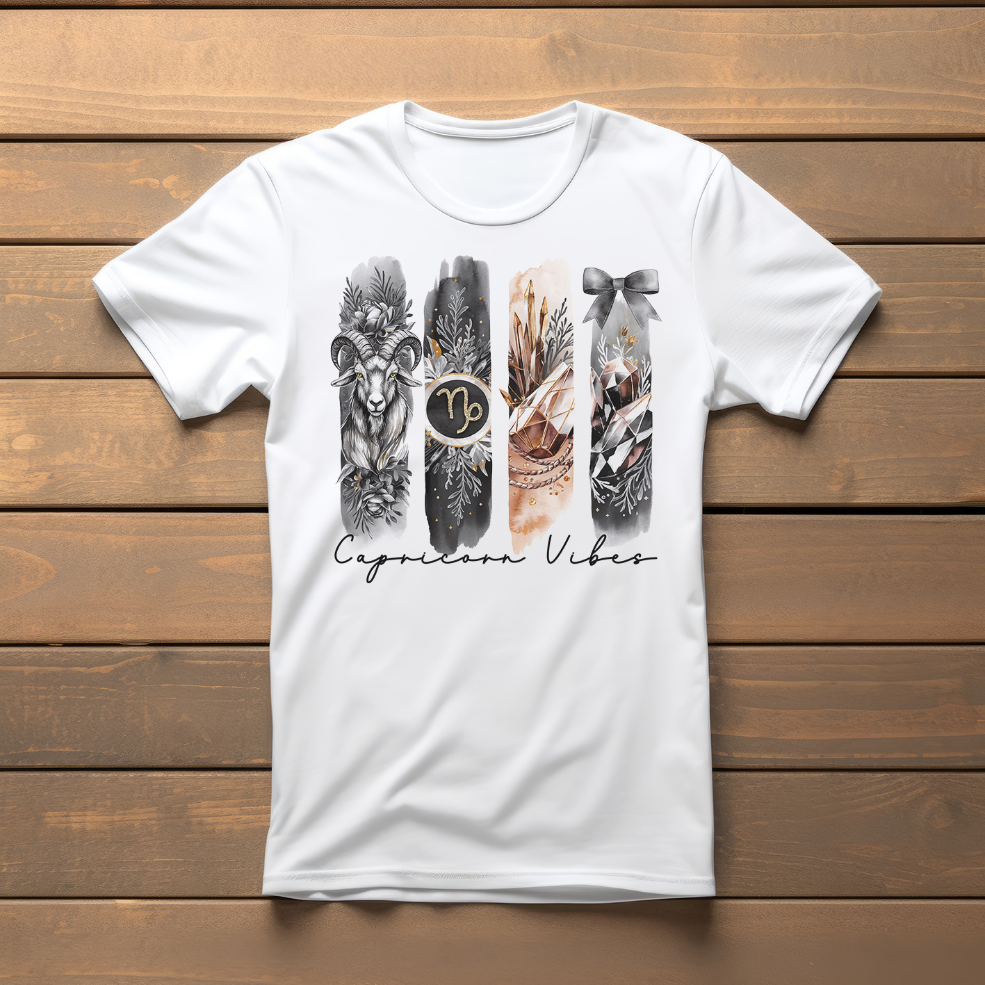 Majica z motivom "Kozoroga". S tem ponosnim motivom pokažite pravo naravo kozoroga: neomajno zvestobo, delavnost, ki premika gore in organiziranost, ki drži vse niti v rokah. Mehka, zračna majica iz kakovostnega bombaža je udobna za vsak dan – za delo, sestanke, druženja ali trenutke, ko želite tiho a odločno pokazati kdo ste.