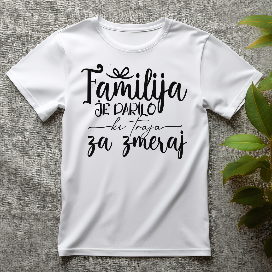 Majica z enobarvnim napisom "Familija je darilo, ki traja za zmeraj". S tem preprostim in globoko čustvenim napisom izrazite največjo hvaležnost do družine – edinstvenega darila, ki ga čas ne more vzeti in ki ostane z vami za vselej. Mehka, zračna majica iz kakovostnega bombaža je udobna za vsak dan – za družinska druženja, praznovanja, sproščene trenutke ali dneve, ko želite nositi sporočilo, ki gre naravnost v srce.
