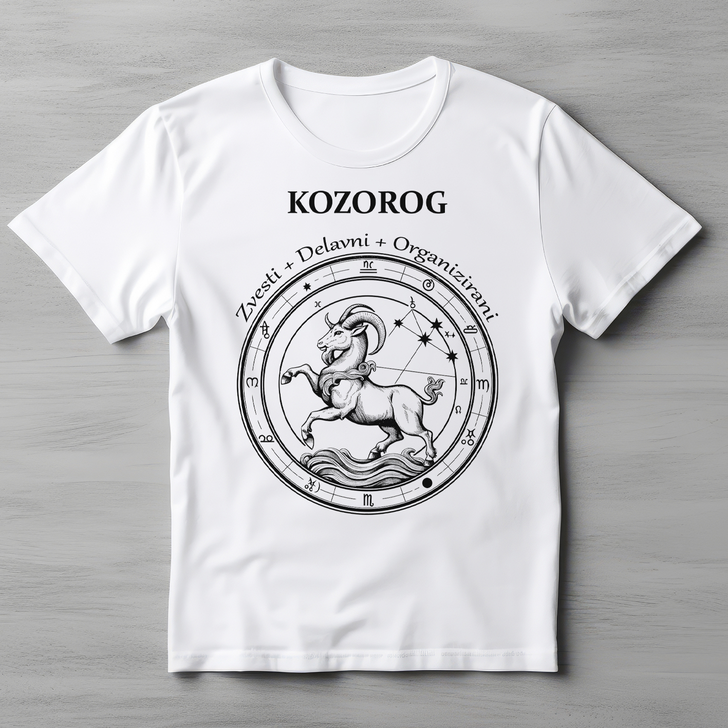 Majica z motivom "Kozoroga". S tem ponosnim motivom pokažite pravo naravo kozoroga: neomajno zvestobo, delavnost, ki premika gore in organiziranost, ki drži vse niti v rokah. Mehka, zračna majica iz kakovostnega bombaža je udobna za vsak dan – za delo, sestanke, druženja ali trenutke, ko želite tiho a odločno pokazati kdo ste.