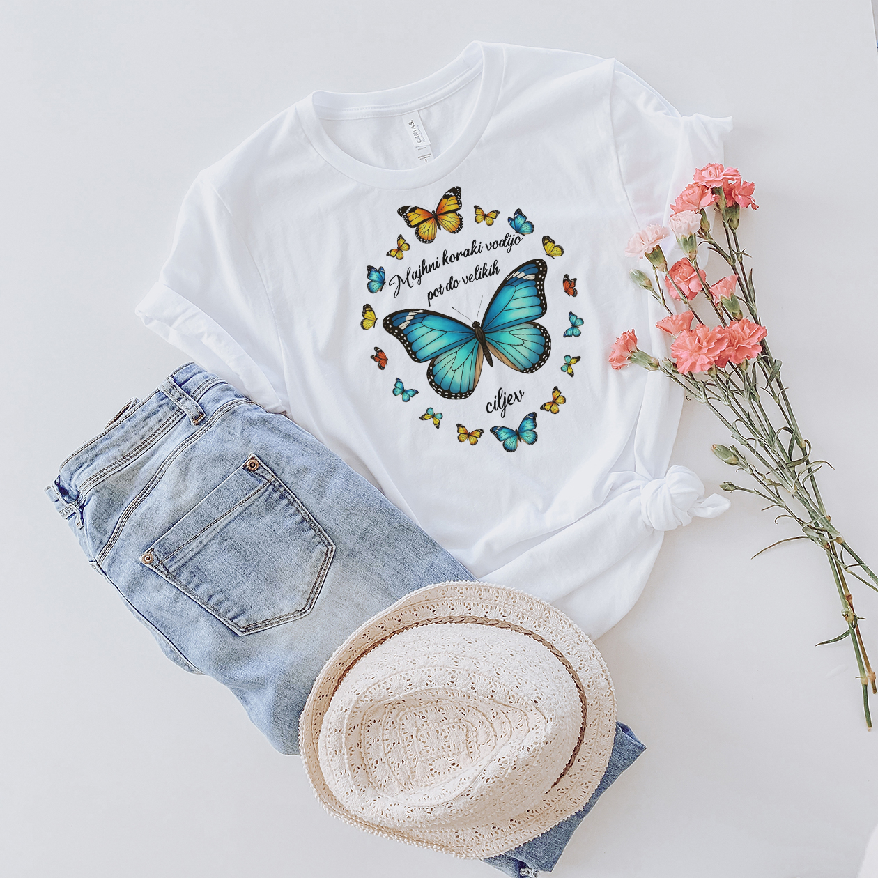 Majica z motivacijskim napisom "Majhni koraki vodijo do velikih ciljev", obdanem z nežnimi, lebdečimi metulji, ki nežno obdajajo besedilo. Metulji simbolizirajo postopno preobrazbo in rast – tako kot majhni koraki vodijo do velikega poleta, napis pa vas spodbuja k vztrajnosti in zaupanju v proces.