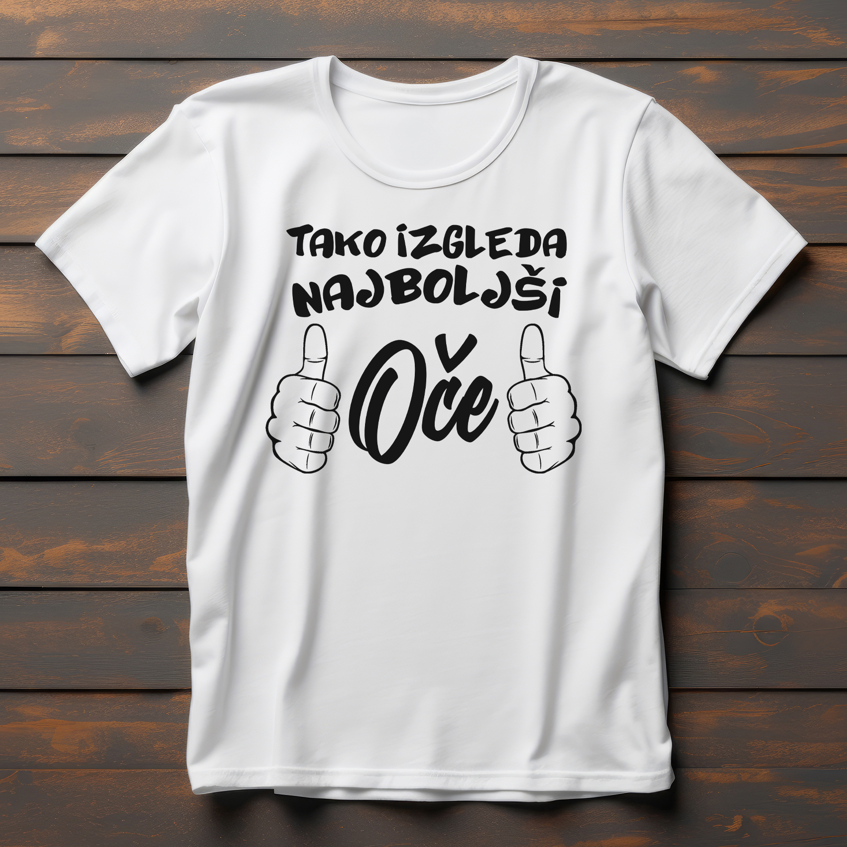 Majica "NAJBOLJŠI OČE" z enobarvno grafiko na sredini, ki prikazuje palca, usmerjena proti obrazu, in drzen napis "NAJBOLJŠI OČE". Pokažite svetu, da ste oče, ki izstopa, z našo edinstveno majico! Ta udobna in stilska majica je idealna za očete, ki s ponosom nosijo svoj naslov in radi izražajo svojo samozavest z igrivim dizajnom. Izdelana je iz mehkega, zračnega materiala, popolnega za vsakdanje podvige ali sproščena družinska srečanja.
