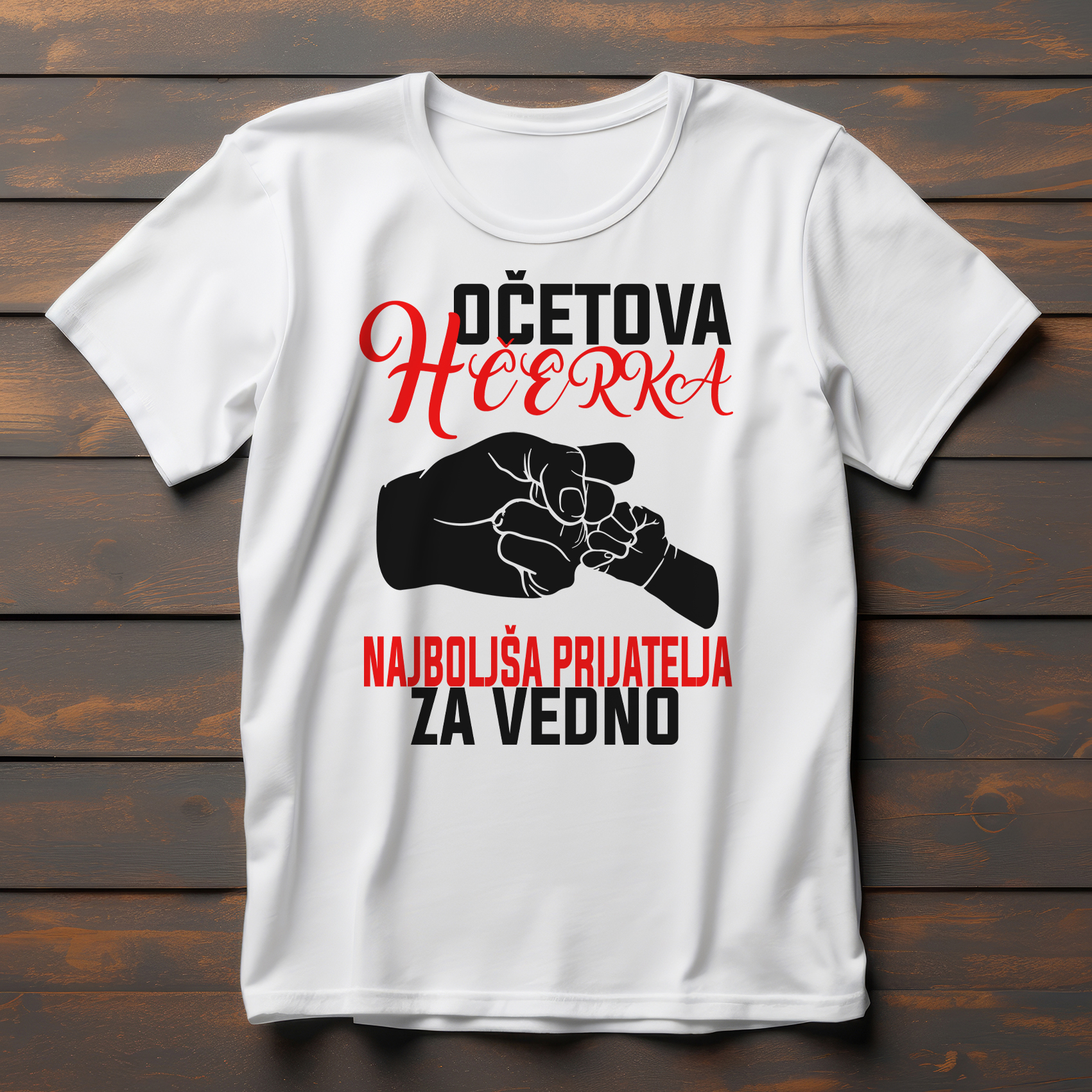Majica "OČETOVA HČERKA" z barvito grafiko na sredini, ki poudari ganljiv napis "OČETOVA HČERKA ZA VEDNO". Pokažite svojo neprekinjeno vez s hčerko z našo edinstveno majico! Ta udobna in trendovska majica je kot nalašč za očete, ki s ponosom nosijo svojo ljubezen do hčerke in radi izražajo to posebno povezanost z živahnim dizajnom. Izdelana je iz mehkega, zračnega materiala, idealnega za vsakodnevne trenutke ali posebne družinske priložnosti.