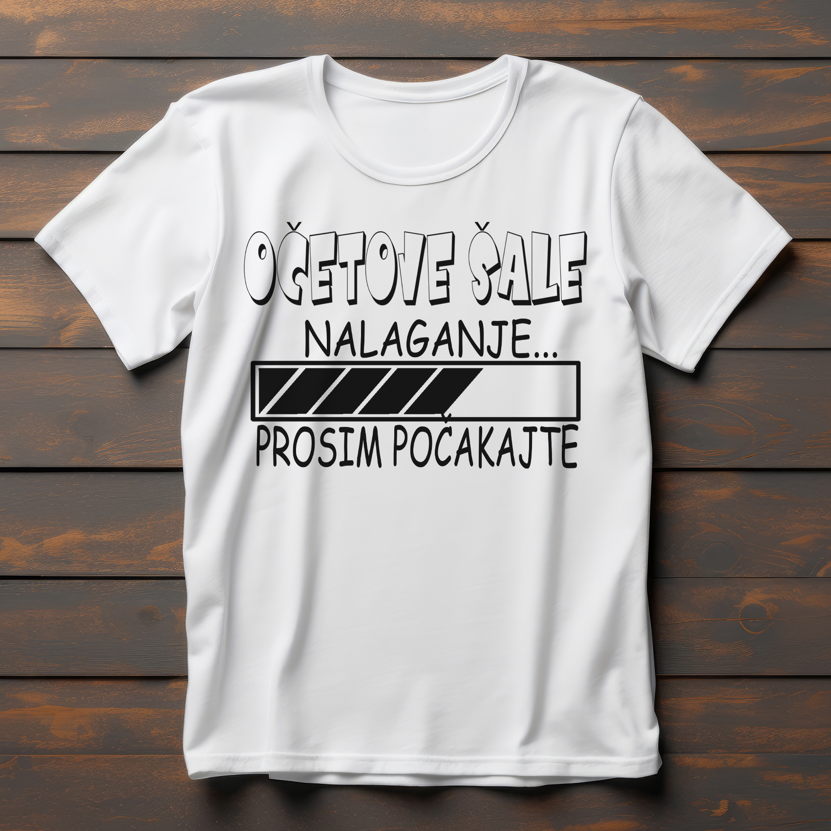 Majica "OČETOVE ŠALE" z enobarvno grafiko na sredini, ki prikazuje napis "OČETOVE ŠALE: NALAGANJE" skupaj s simpatično sličico in pripisom "PROSIM POČAKAJTE". Pokažite svoj edinstven smisel za humor kot oče z našo zabavno majico! Ta udobna in stilska majica je kot nalašč za očete, ki radi nasmejijo družino in prijatelje s svojimi šalami. Izdelana je iz mehkega, zračnega materiala, idealnega za vsakodnevne trenutke ali sproščena druženja.
