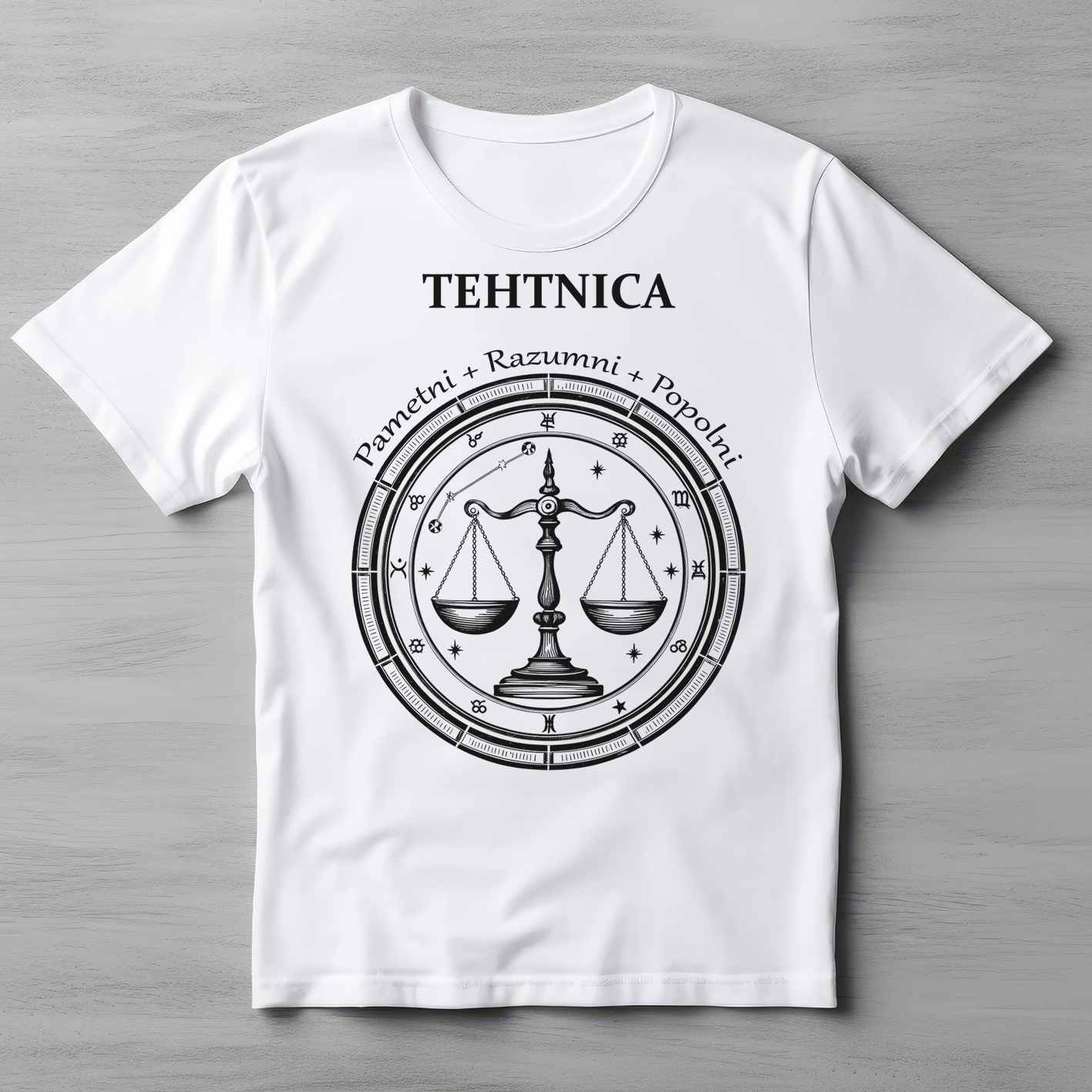 Majica z motivom "Tehtnica". S tem prefinjenim in uravnoteženim motivom pokažite pravo tehtniško naravo: ostro pamet, ki vidi vse plati, razumnost, ki vedno najde pravo mero, in stremljenje k popolnosti, ki ustvarja harmonijo povsod. Mehka, zračna majica iz kakovostnega bombaža je udobna za vsak dan – za odločanje, druženja, estetske trenutke ali dneve, ko želite pokazati svojo diplomatsko in elegantno stran.