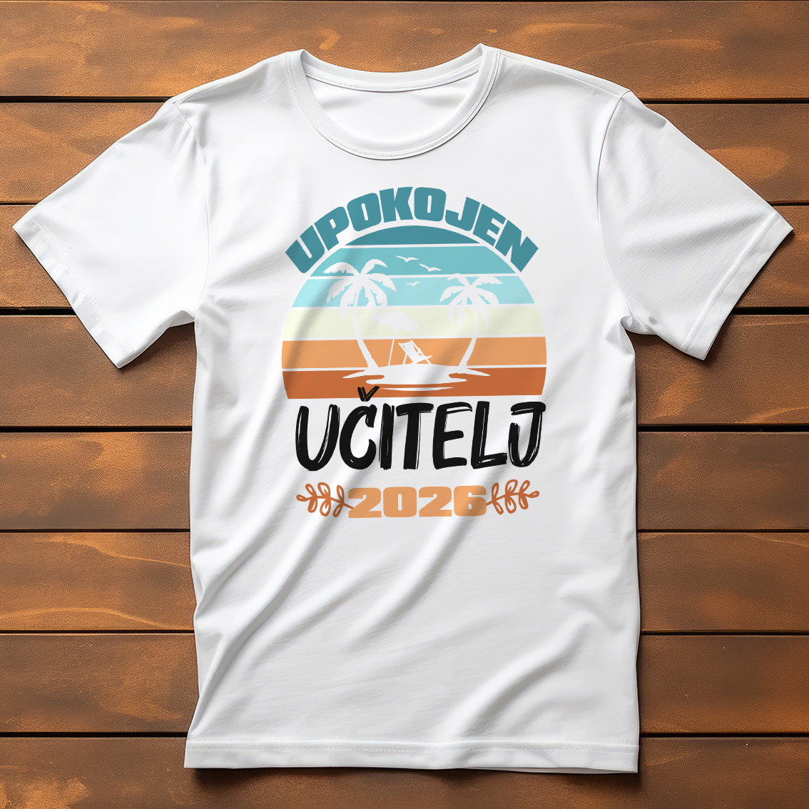 Majica s prelepo tropsko grafiko – palma, ki se nagne nad turkiznim morjem v prelepi barvani grafiki, na na vrhu in spodaj pa velik personaliziran napis, npr. »Upokojena učiteljica 2026« (z možnostjo izbire spola, poklica in letnice!).