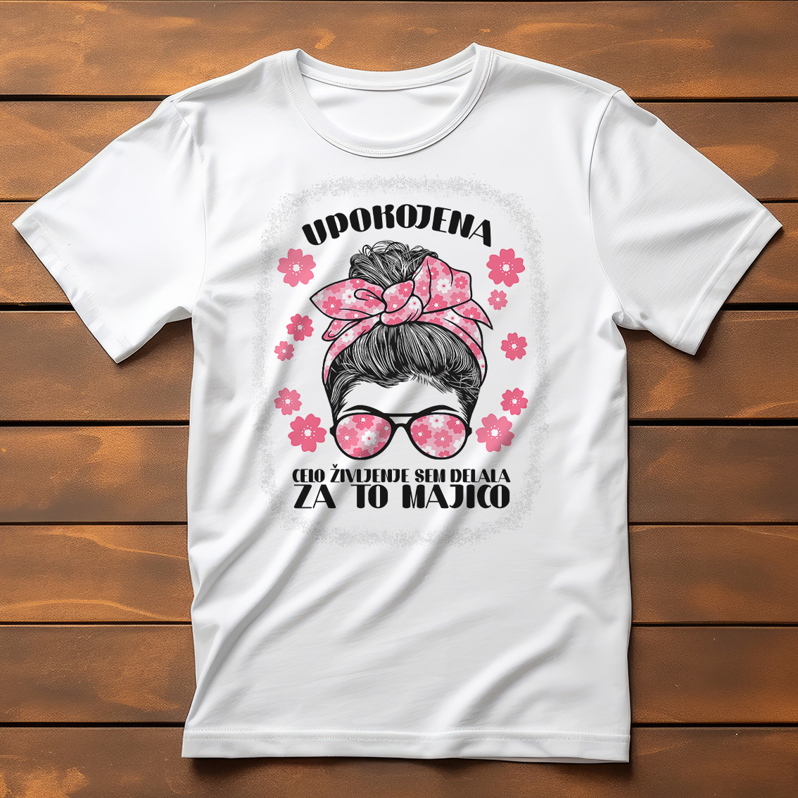 Majica s prelepo barvno grafiko – nežnimi rožicami in velikim, barvnim napisom »Upokojena, delala sem celo življenje za to majico«.