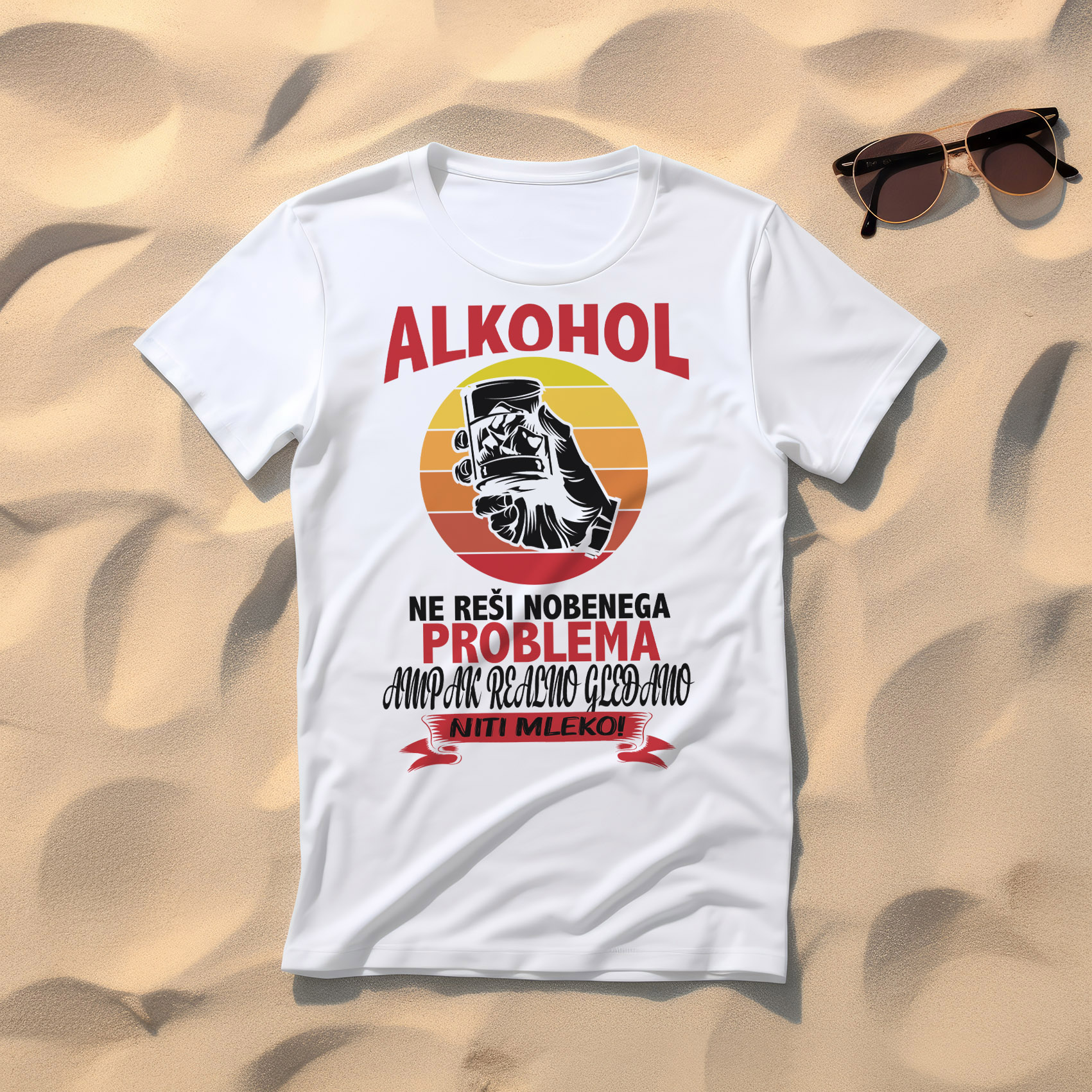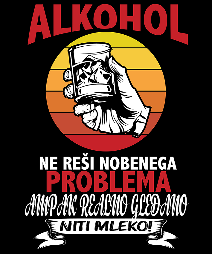 Majica "Alkohol ne reši nobenega problema, ampak če realno gledamo, tudi mleko ne". Pokažite svoj sarkastičen smisel za humor z našo duhovito majico! Ta udobna in trendovska majica je idealna za tiste, ki radi s ščepcem ironije pristopijo k življenjskim resnicam. Izdelana iz kakovostnega, zračnega materiala, je popolna za sproščene dni ali druženja s prijatelji.