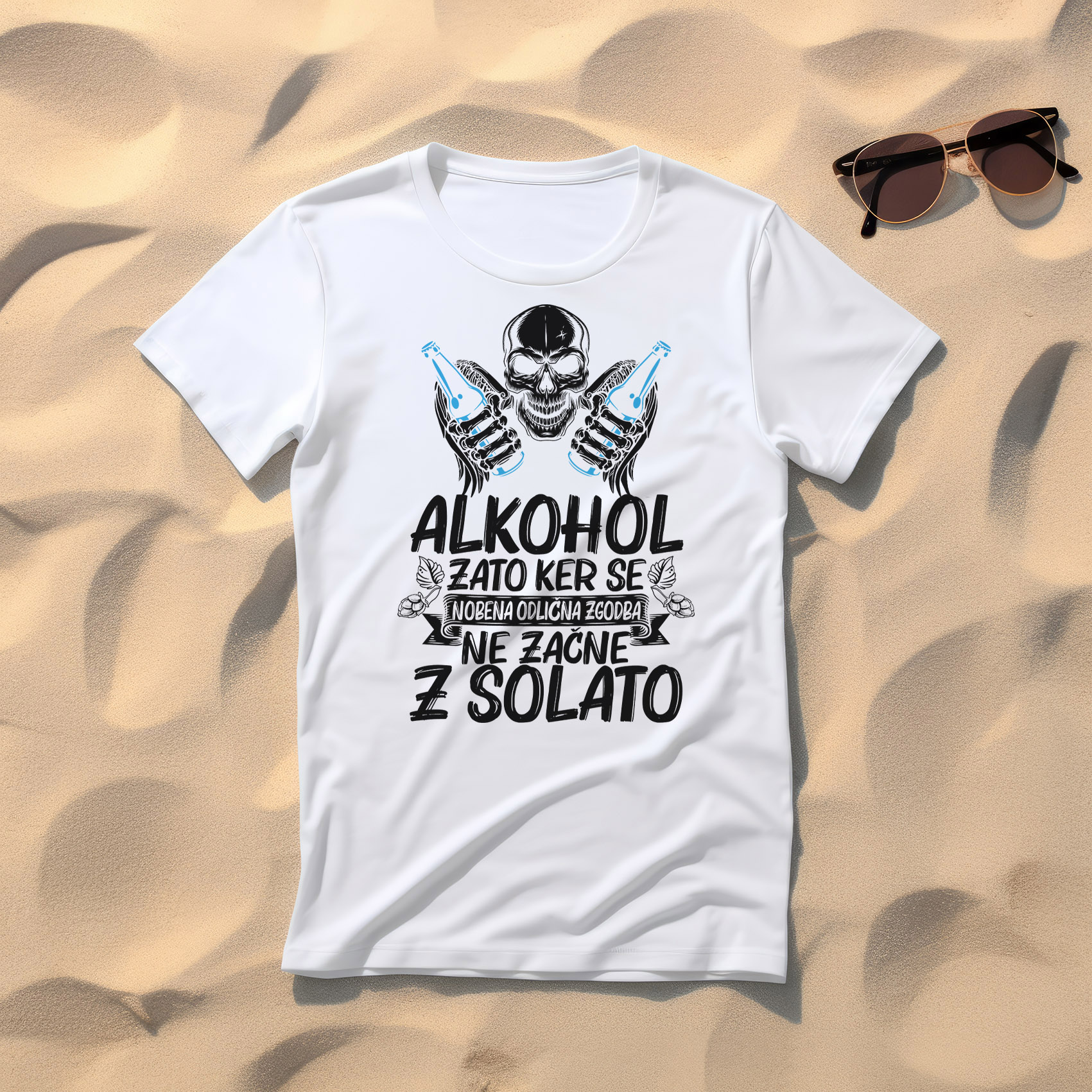 Majica "Alkohol, ker se nobena odlična zgodba ne začne z solato". Pokažite svoj šaljiv in družaben duh z našo edinstveno majico! Ta udobna in stilska majica je popolna za vse, ki vedo, da se najboljše zgodbe pišejo ob kozarcu ali dveh. Izdelana iz mehkega, zračnega materiala, je idealna za zabave, sproščene večere ali kot duhovito darilo.