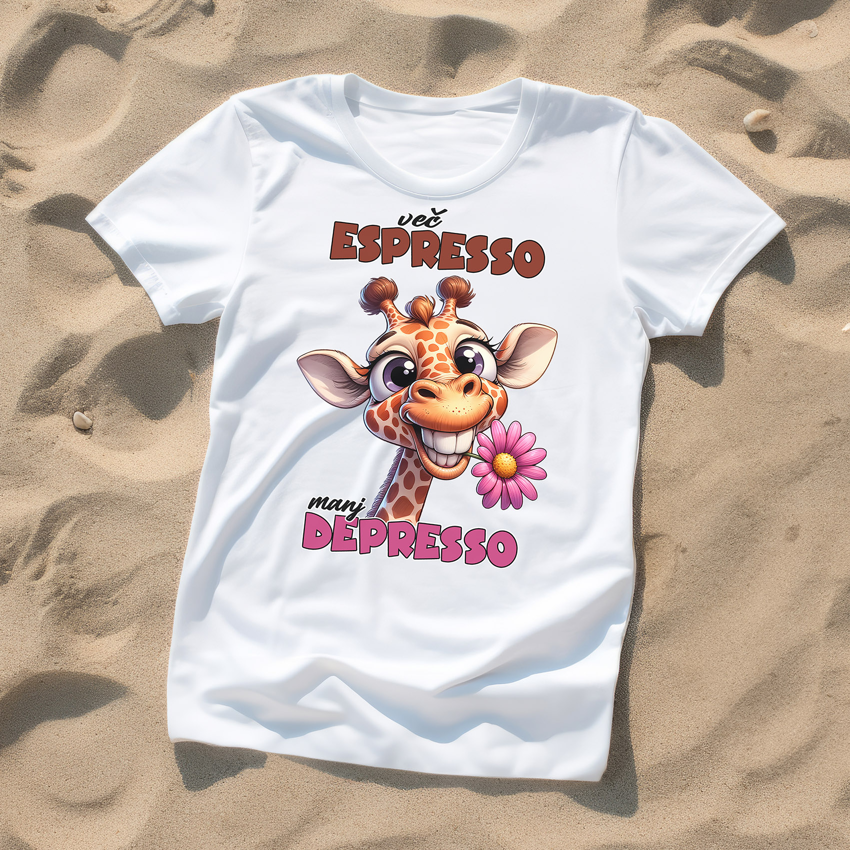 Zakaj izbrati to majico? Ni samo oblačilo – je dnevni opomnik, da več espressa res pomeni manj depressa. Popolna za ljubitelje kave, za službene odmore, vikende ali kot ljubko darilo za prijateljico, ki tudi verjame v moč kofeina. Vesela žirafa z rožo bo zagotovo nasmejala vse okoli in dvignila razpoloženje.
