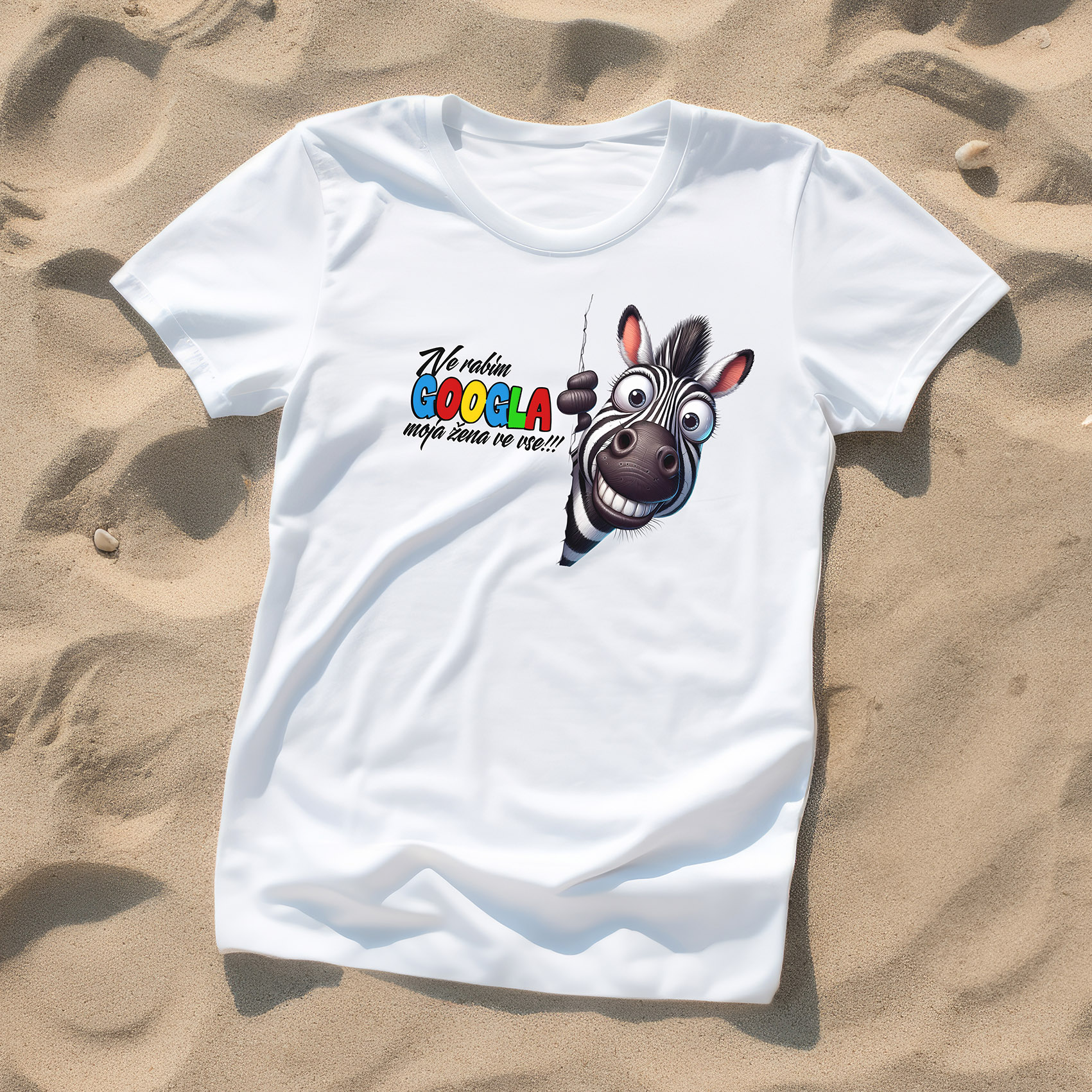 Majica z barvitim Google logotipom v različnih odtenkih in zebro, ki radovedno kuka iz strani, ter duhovitim napisom "NE RABIM GOOGLA MOJA ŽENA VE VSE". S tem klasičnim in relatabilnim motivom na zabaven način priznajte, da je vaša žena pravi vir vsega znanja! Udobna majica iz mehkega, zračnega materiala je idealna za vsakdanje nošenje, družinska druženja ali trenutke, ko želite nasmejati partnerko (ali opozoriti nase).
