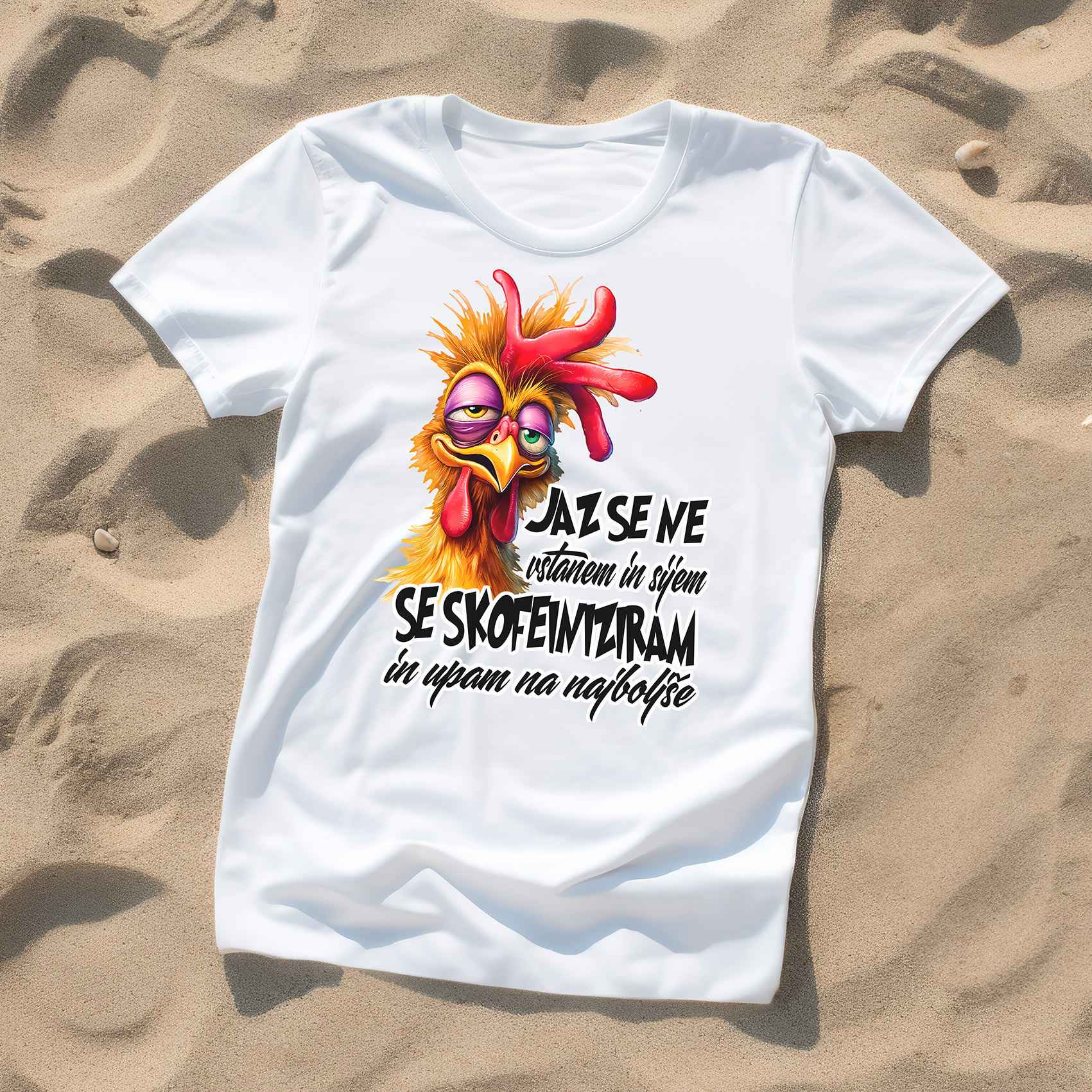 Majica s smešnim petelinom, ki je celo natečen, komaj zbujen in videti povsem nejevoljen, ter napisom "JAZ SE NE ZBUJAM IN SI JEMLJEM KOFEIN IN UPAM NA NAJBOLJŠE". S tem jutranjim humornim motivom na relatabilen način pokažite svojo ljubezen do počasnih vstajanj in kave! Udobna majica iz mehkega, zračnega materiala je idealna za vse, ki zjutraj niso za kukuričkanje – za casual dneve, delo od doma ali vikend poležavanje.