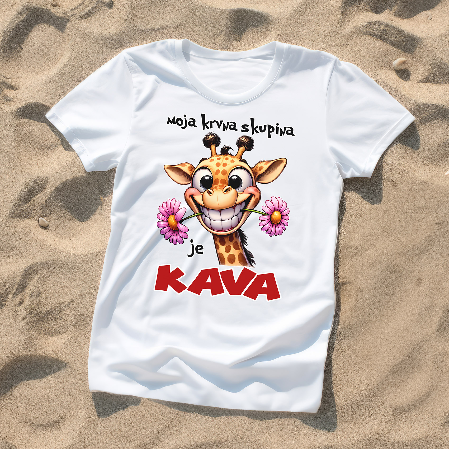 Majica z lušno žirafico, ki nežno drži rožico v ustih, in duhovitim napisom "MOJA KRVNA SKUPINA JE KAVA". S tem simpatičnim in relatabilnim motivom pokažite svojo odvisnost od kave na najbolj ljubek način! Udobna majica iz mehkega, zračnega materiala je idealna za vse kavo-odvisnike, jutranje rituale ali casual dneve, ko brez kofeina preprosto ne gre.
