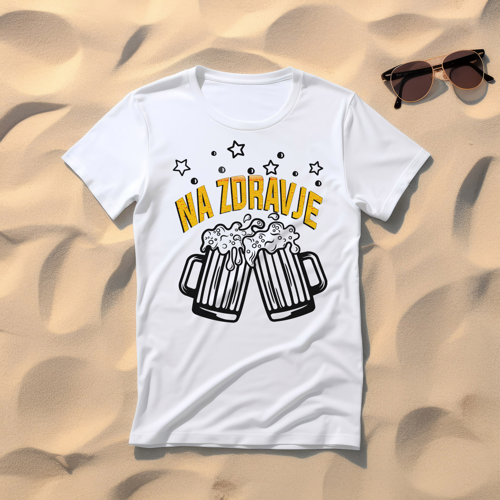 Majica "Na zdravje" s sliko dveh kriglov, ki nazdravljata. Proslavite dobre trenutke z našo veselo majico! Ta udobna in stilska majica z živahno grafiko je popolna za vse, ki radi dvignejo kozarec v družbi prijateljev. Izdelana iz mehkega, zračnega materiala, je idealna za pivske večere, zabave ali sproščeno nošenje.