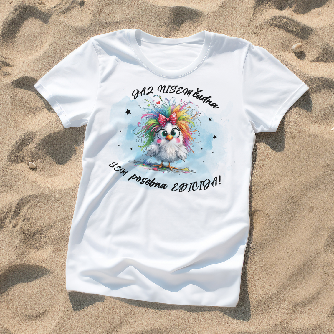 Majica s prelepo grafiko belega ptička z barvanimi dolgimi lasmi, rdečo mašnico in nedolžnim, ljubkim pogledom, ter napisom "JAZ NISEM ČUDNA SEM POSEBNA EDICIJA". S tem simpatičnim in samoironičnim motivom na ljubek način proslavite svojo edinstvenost! Udobna majica iz mehkega, zračnega materiala je idealna za vse, ki se počutijo malo drugačne (na najboljši način) – za vsakdanje nošenje, druženja ali dneve, ko želite širiti pozitivno energijo.
