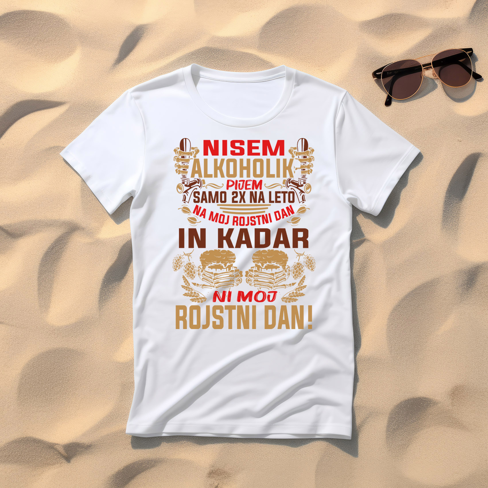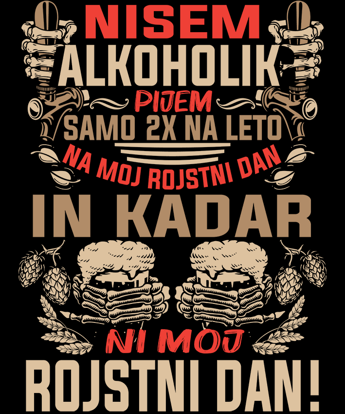 Majica "Nisem alkoholik, pijem samo 2x na leto: na moj rojstni dan in kadar ni moj rojstni dan". Nasmejite vse okoli sebe z našo šaljivo majico! Ta udobna in moderna majica je idealna za tiste, ki radi s humorjem izrazijo svojo ljubezen do pijače. Izdelana iz mehkega, zračnega materiala, je popolna za zabave, sproščene večere ali vsakodnevno nošenje.