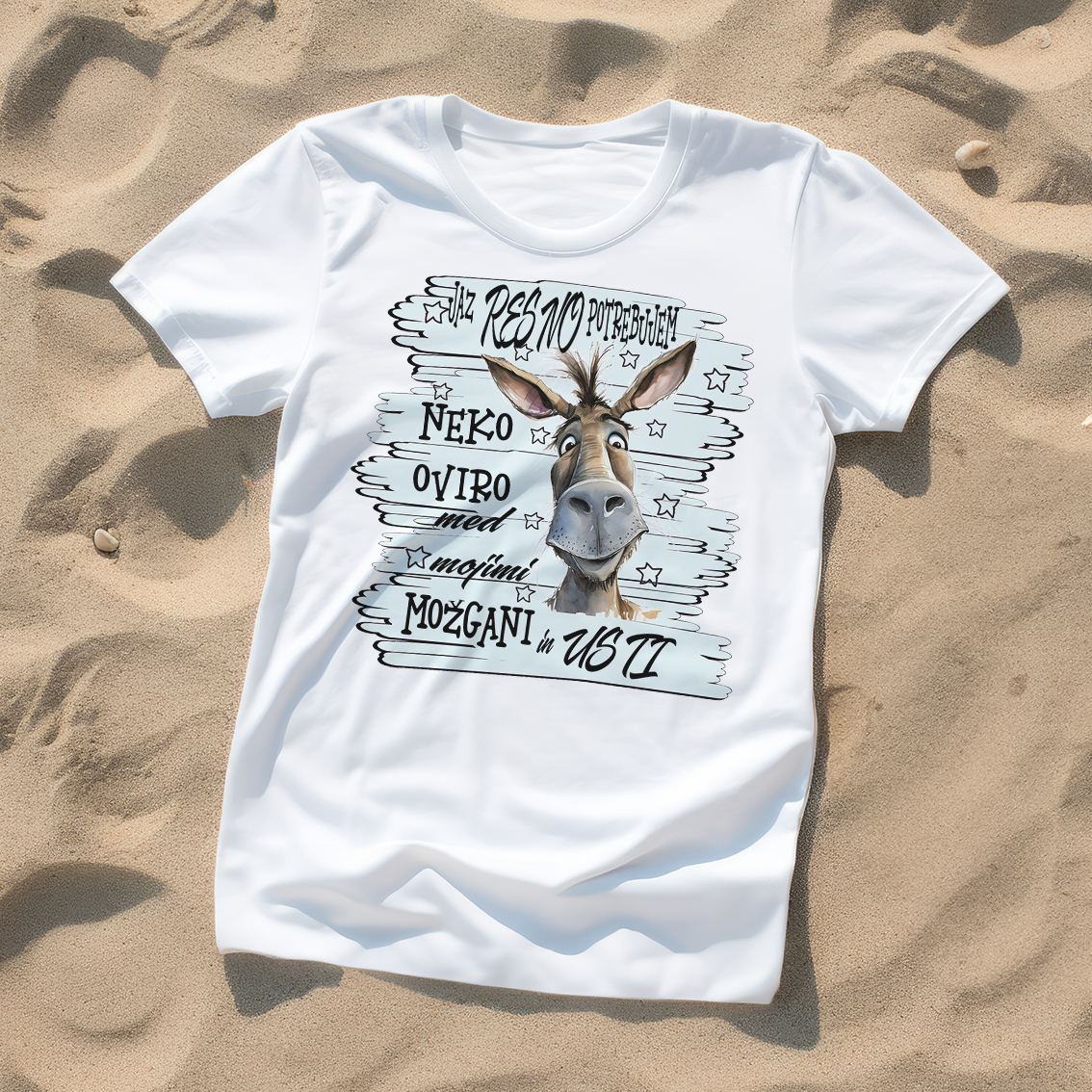 Majica z extra risanim oslom, obdanim z zvezdicami na modrem ozadju, in sarkastičnim napisom "JAZ RESNO POTREBUJEM NEKO OVIRO MED MOJIMI MOŽGANI IN USTI". S tem humornim in samoironičnim motivom na zabaven način priznajte, da včasih govorite prej, kot pomislite! Udobna majica iz mehkega, zračnega materiala je idealna za vse, ki potrebujejo "filter" za svoje misli – za vsakdanje nošenje, druženja ali trenutke, ko bi raje molčali.