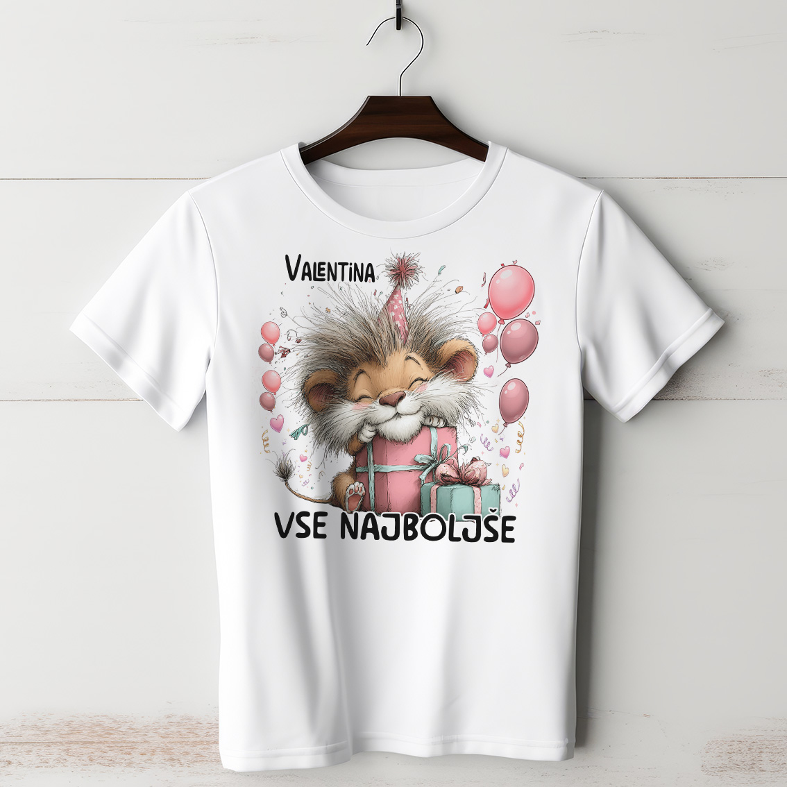 Majica s prelepo barvno grafiko – prikupnim levčkom z lepim pričeskom, ki sloni na darilih z zaprtimi očmi in rojstnodnevnim klobučkom, rozastim ozadjem, balončki okoli in raznoraznimi dodatki v roza barvah za punčko, na vrhu personaliziranim imenom (po vaših željah) in spodaj velikim napisom »Vse najboljše«.