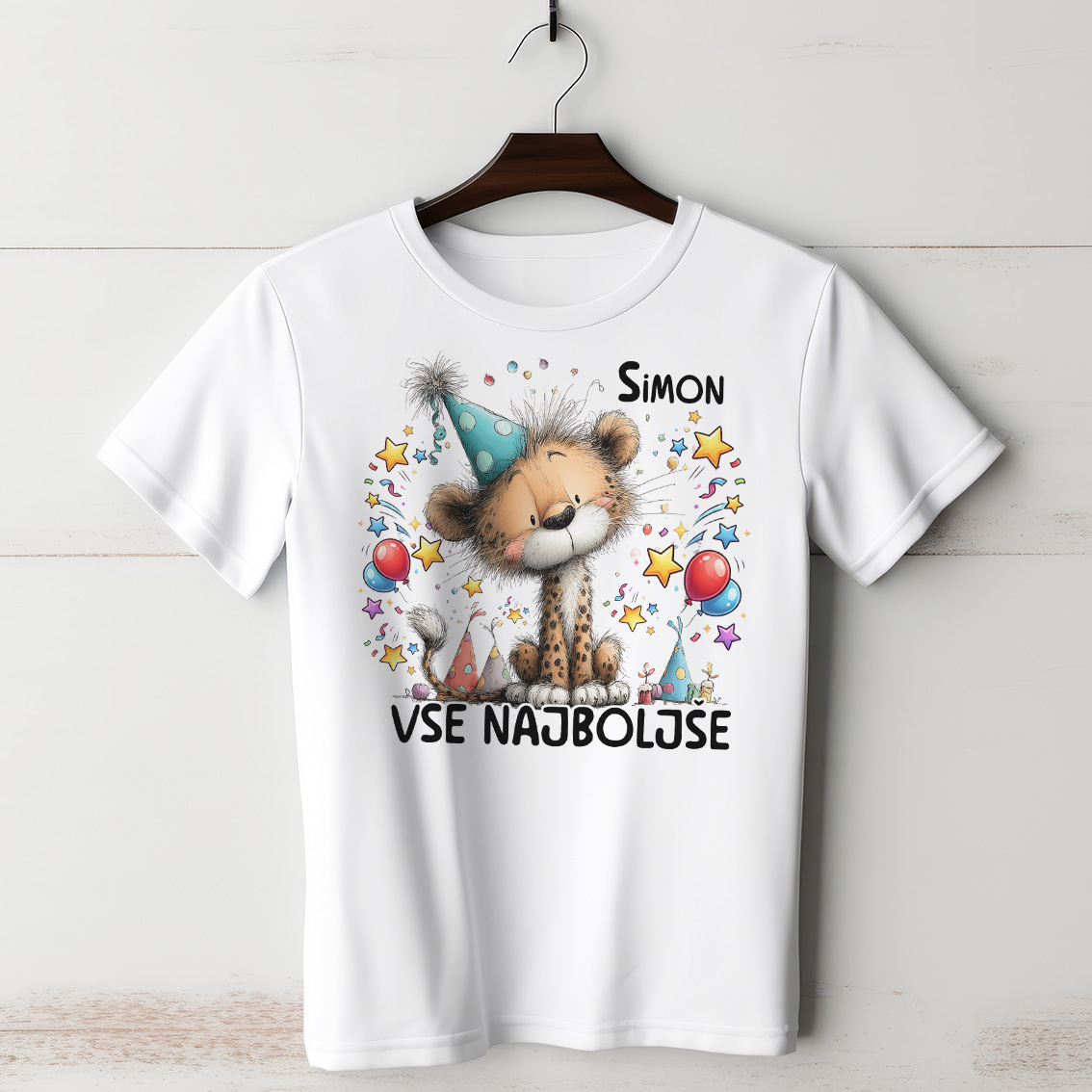 Majica s prelepo barvno grafiko – prikupnim levčkom, ki sedi z rojstnodnevnim klobučkom, vsebarvnim ozadjem, balončki okoli in raznoraznimi dodatki v mešanih barvah za fanta, na vrhu personaliziranim imenom (po vaših željah) in spodaj velikim napisom »Vse najboljše«.