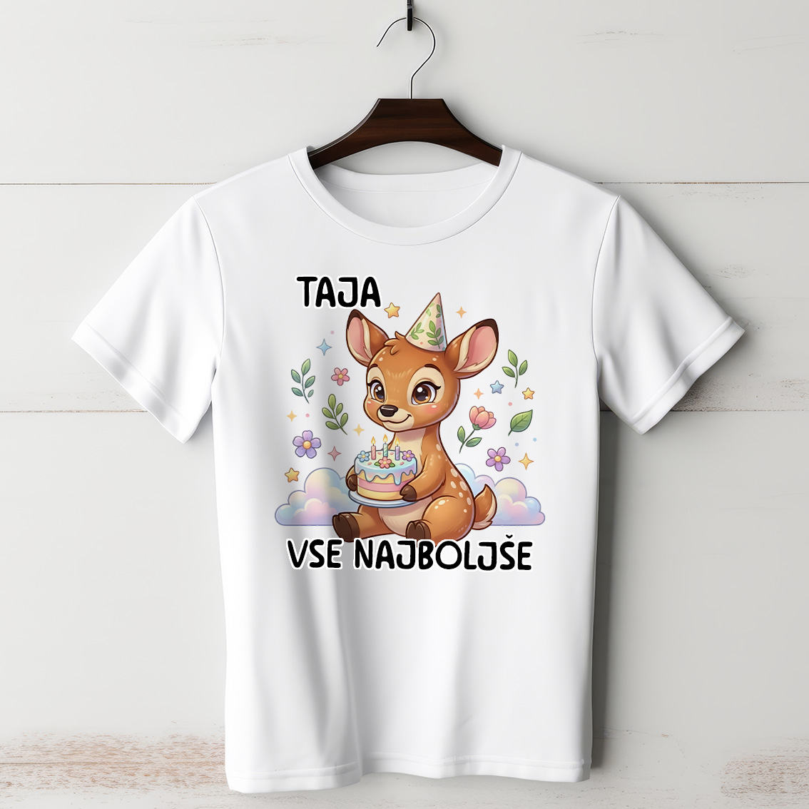 Majica s prikupnim Disneyjevim Bambijem – nasmejanim in nežnim srnčkom z velikimi očmi, ki v tačkah drži slastno rojstnodnevno torto, v lepem ozadju z nežnimi listki in gozdno čarobnostjo, ob njem pa velik napis »Vse najboljše« (z možnostjo dodajanja imena!).