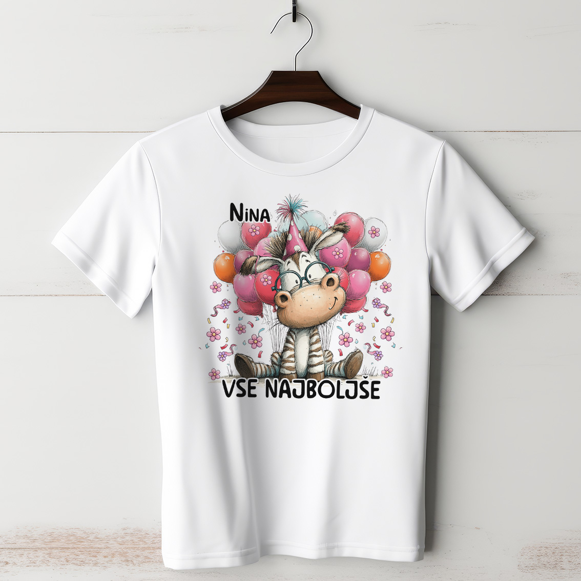 Majica z očarljivo barvno grafiko – prikupno sedečo zebrico z modnimi očali, ki mirno sedi s črtastim nasmehom in uživa v trenutku, obdano z nežnimi rozastimi dodatki in lebdečimi balončki, ki ustvarijo pravo rojstnodnevno vzdušje, na vrhu personaliziranim imenom (po vaših željah) in spodaj velikim napisom »Vse najboljše«.