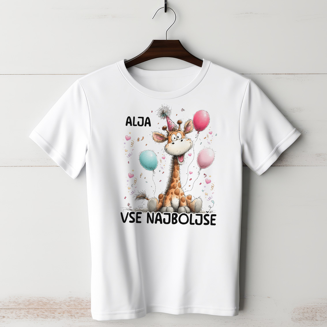 Majica z očarljivo barvno grafiko – prikupno sedečo žirafico, obdano z nežnimi barvitimi dodatki, ki so večinoma v mehkih roza odtenkih, in lebdečimi balončki, ki ustvarijo pravo rojstnodnevno vzdušje, na vrhu personaliziranim imenom (po vaših željah) in spodaj velikim napisom »Vse najboljše«.