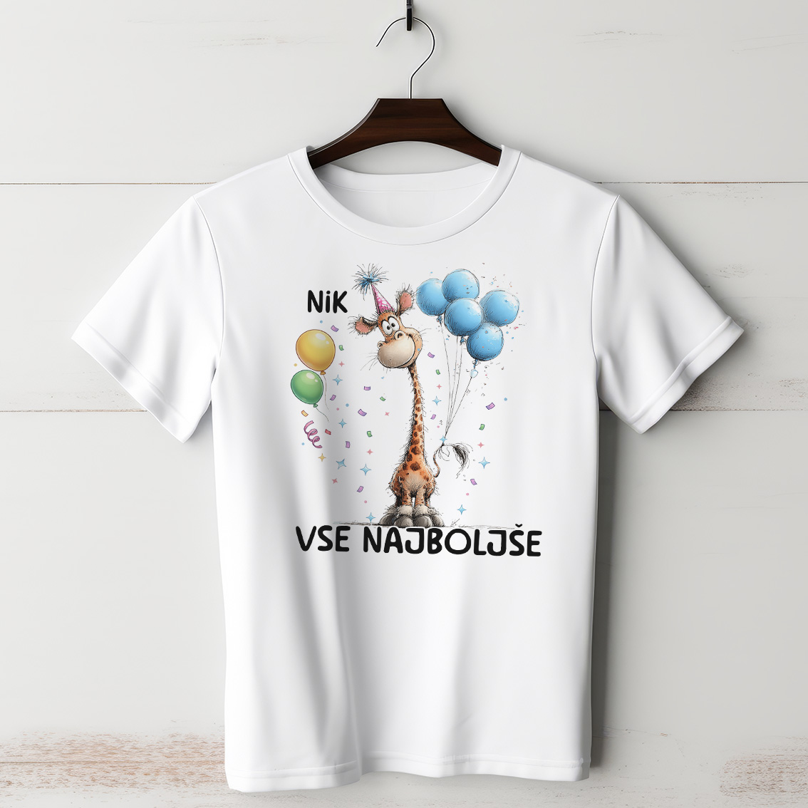 Majica z očarljivo barvno grafiko – prikupno stoječo žirafico, obdano z raznolikimi barvitimi dodatki in lebdečimi balončki, ki ustvarijo pravo rojstnodnevno vzdušje, na vrhu z personaliziranim imenom (po vaših željah) in spodaj velikim napisom »Vse najboljše«.