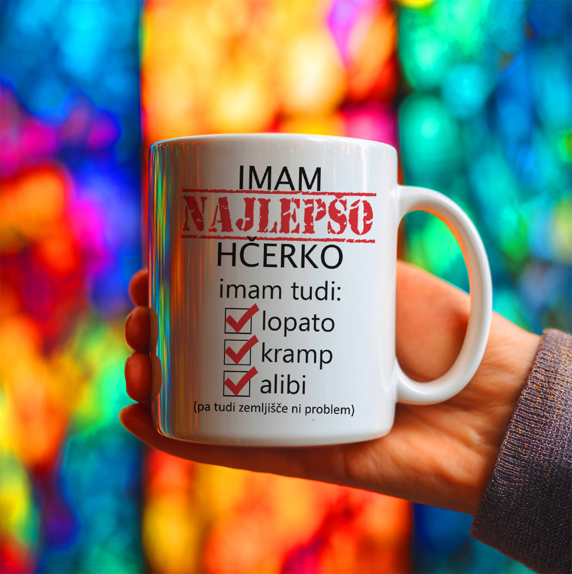 Šalica z duhovitim napisom "Imam prelepo hčerko, imam tudi pištolo, lopato in alibi" Pokažite svojo zaščitniško naravo in smisel za humor z našo edinstveno šalico! Ta kakovostna keramična šalica prostornine 330 ml je idealna za očete, ki želijo z duhovitim sporočilom pritegniti nasmehe. Motiv je natisnjen trpežno, da ostane lep tudi po mnogih pranjih v pomivalnem stroju, popolna pa je za jutranjo kavo, pisarniške pavze ali sproščene priložnosti.