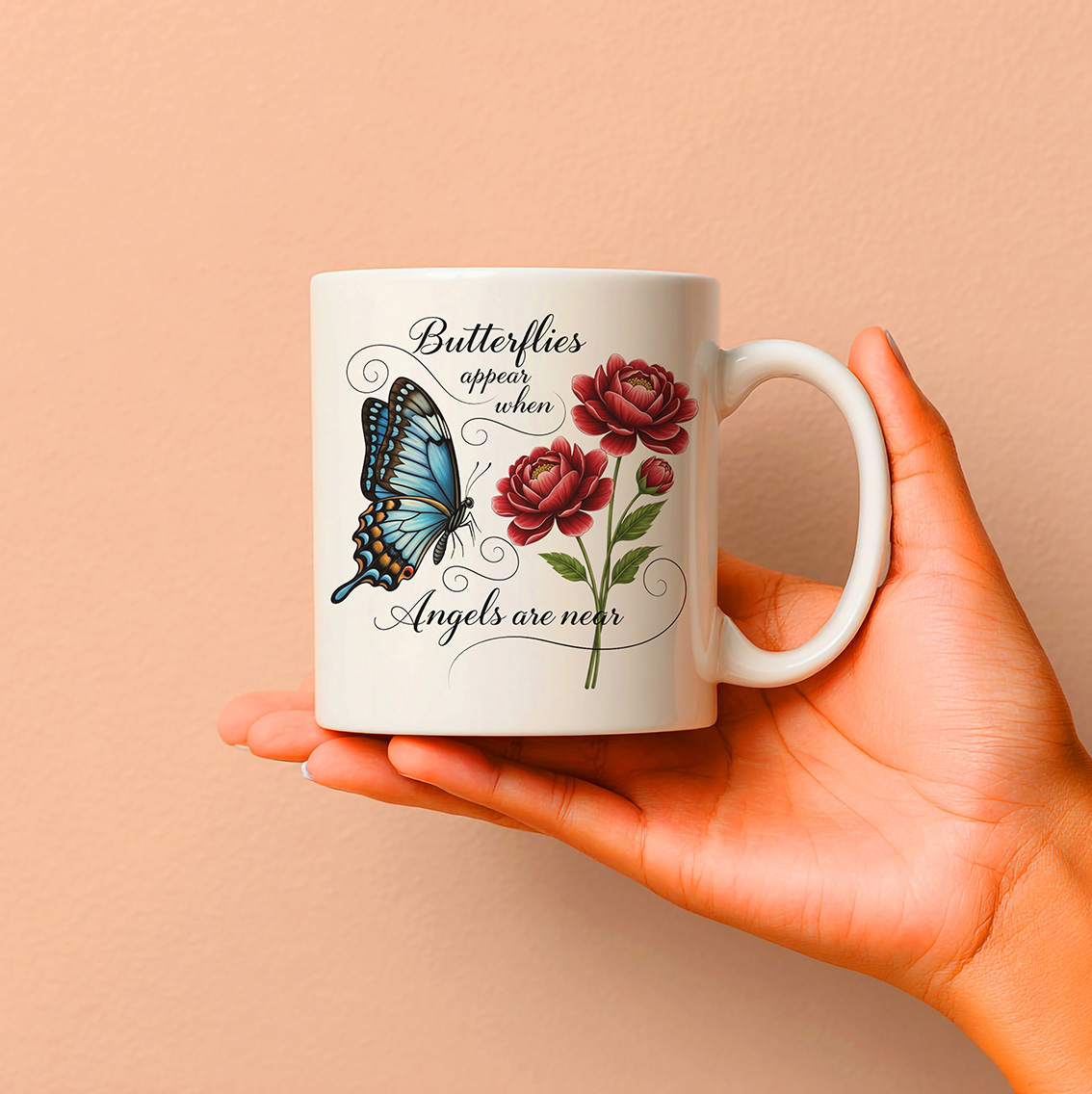 Keramična šalica z nežnim in čarobnim angleškim napisom "Butterflies appear when angels are near", obdanem z romantično grafiko: čudovite vrtnice v polnem cvetu in velik, prelep moder metulj, ki nežno lebdi med njimi. Ta dizajn prinaša občutek angelske prisotnosti, zaščite in duhovne povezave – metulj simbolizira duše ali angele, vrtnice pa ljubezen, lepoto in spomin.