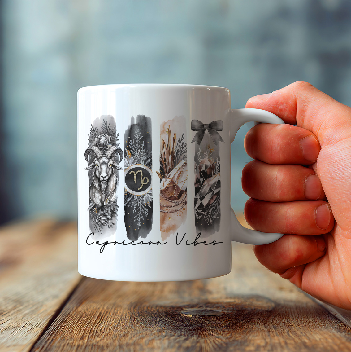 Šalica z motivom "Kozoroga". Začnite dan kot pravi Kozorog: z skodelico kave ali čaja, ki vas spomni na vaše največje prednosti – zvestobo, delavnost in popolno organiziranost. Kakovostna keramična šalica prostornine 330 ml odlično ohranja toploto, motiv pa je natisnjen trpežno, da prenese številna pranja v pomivalnem stroju.