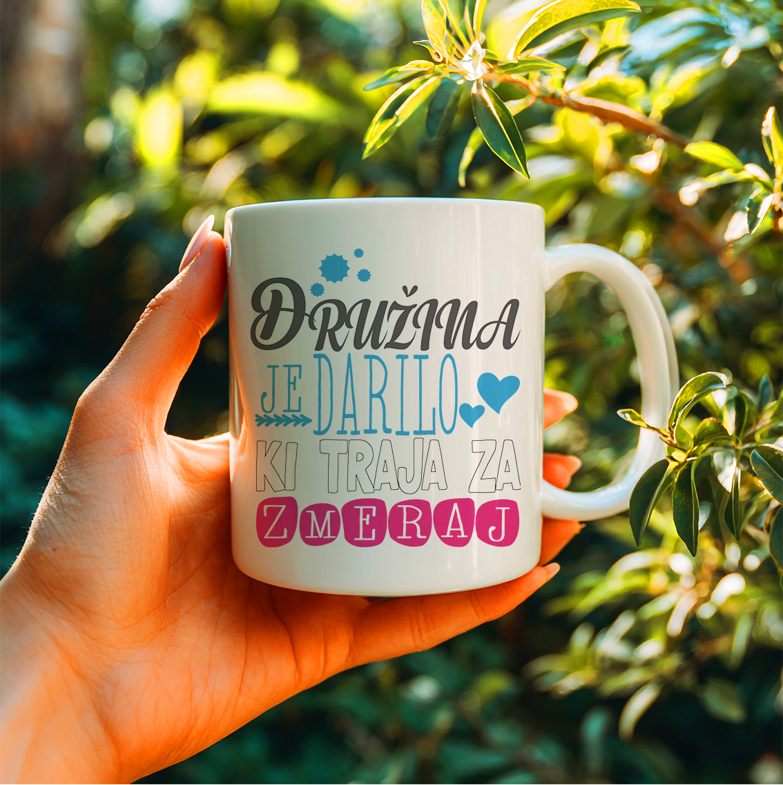 Šalica z enakim lepim barvnim napisom "Družina je darilo, ki traja za zmeraj". Začnite dan s skodelico kave ali čaja, ki vas nežno spomni na največji dar – družino, ki ostane za zmeraj. Kakovostna keramična šalica prostornine 330 ml odlično drži toploto, napis pa je natisnjen trpežno, da ostane lep tudi po mnogih pranjih v pomivalnem stroju.