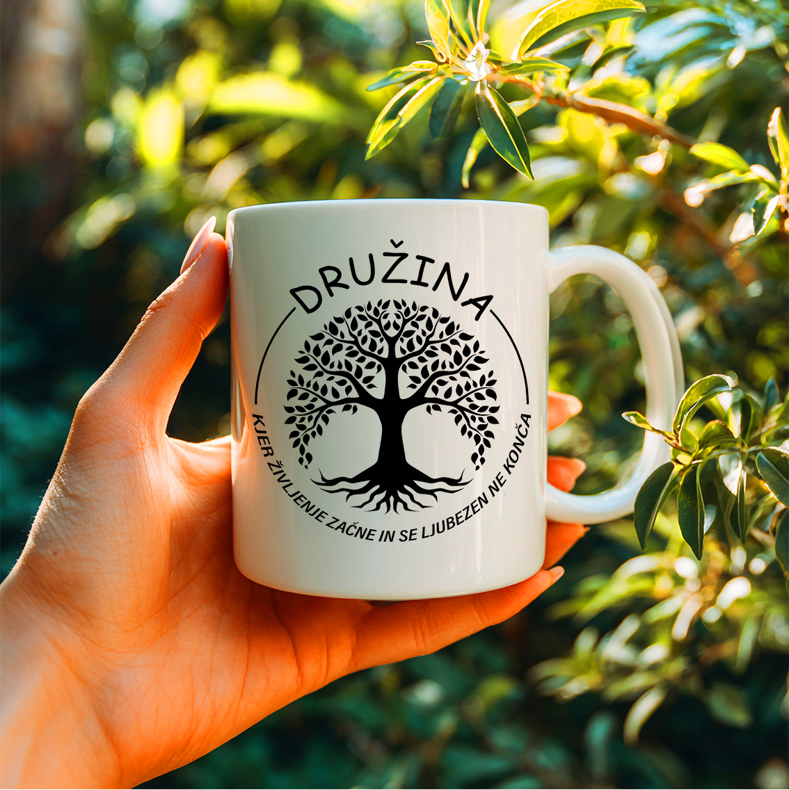 Šalica z enakim enobarvnim motivom družinskega drevesa na sredini in napisom okoli "Družina – kjer se življenje začne in ljubezen ne konča". Začnite dan s skodelico kave ali čaja, ki vas spomni na največjo vrednoto – družino, kjer se začne življenje in kjer ljubezen nikoli ne ugasne. Kakovostna keramična šalica prostornine 330 ml odlično drži toploto, motiv pa je natisnjen trpežno, da ostane lep tudi po mnogih pranjih v pomivalnem stroju.