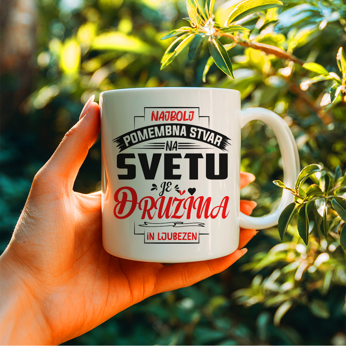 Šalica z enakim lepim barvnim napisom "Najbolj pomembna stvar na svetu je družina in ljubezen". Začnite dan s skodelico kave ali čaja, ki vas nežno spomni na največjo resnico – da sta družina in ljubezen tisto, kar resnično šteje. Kakovostna keramična šalica prostornine 330 ml odlično drži toploto, napis pa je natisnjen trpežno, da ostane lep tudi po mnogih pranjih v pomivalnem stroju.