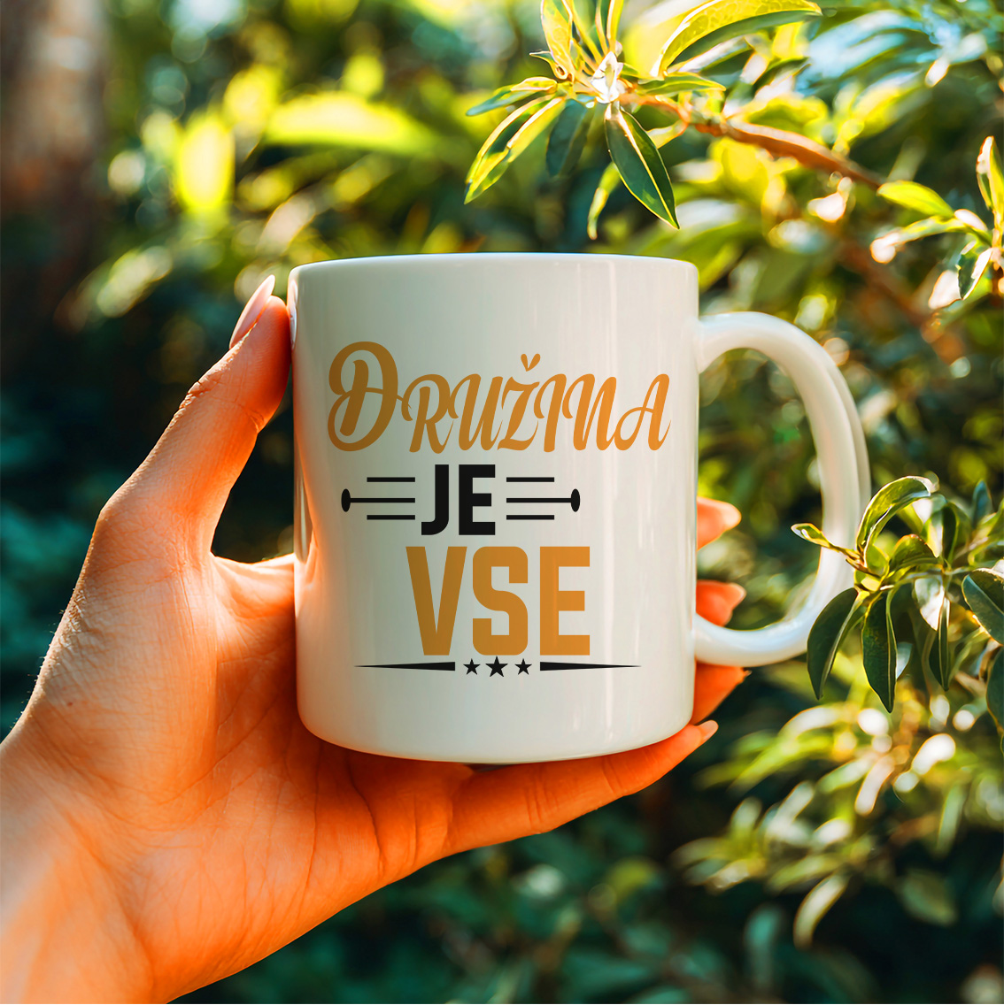 Šalica z enakim lepim barvnim napisom "Družina je vse". Začnite dan s skodelico kave ali čaja, ki vas nežno spomni na najpomembnejšo stvar – družino, ki je res vse. Kakovostna keramična šalica prostornine 330 ml odlično drži toploto, napis pa je natisnjen trpežno, da ostane lep tudi po mnogih pranjih v pomivalnem stroju.