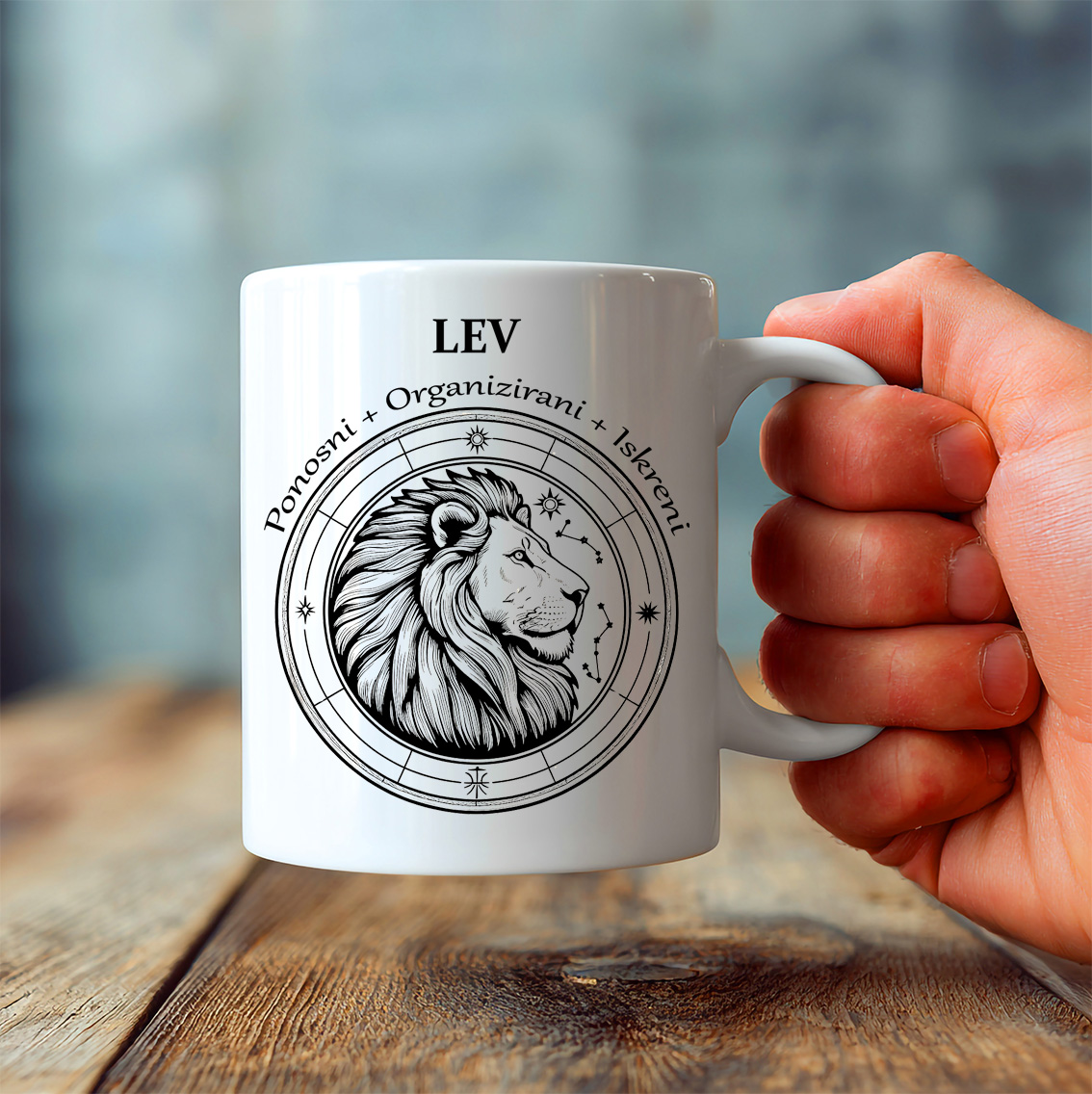 Šalica z enakim motivom "Lev". Začnite dan kot pravi Lev: z skodelico kave ali čaja, ki vas spomni na vašo največjo moč – ponos, organiziranost in iskrenost. Kakovostna keramična šalica prostornine 330 ml odlično ohranja toploto, motiv pa je natisnjen trpežno, da prenese številna pranja v pomivalnem stroju.