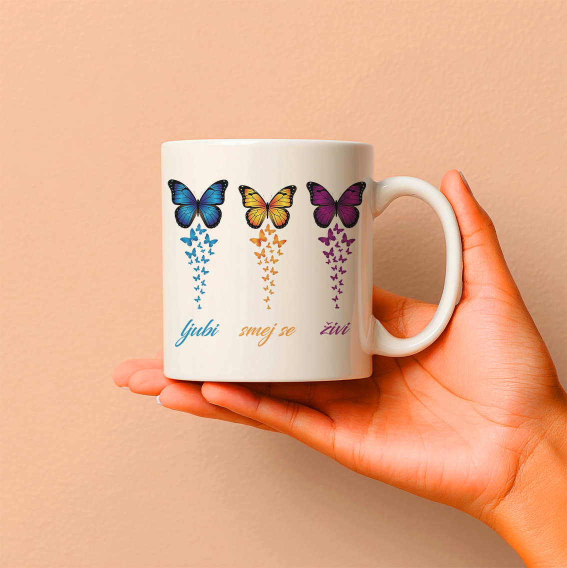 Keramična šalica z preprostim, a močnim napisom "Ljubi – smej se – živi", kjer je nad vsako besedo nežna linija metuljev, ki se od majhnih pri prvi besedi postopoma povečujejo do velikih pri zadnji. Ta rast metuljev simbolizira, kako ljubezen, smeh in življenje rastejo in se krepijo – od majhnih trenutkov do polnega, svobodnega poleta.