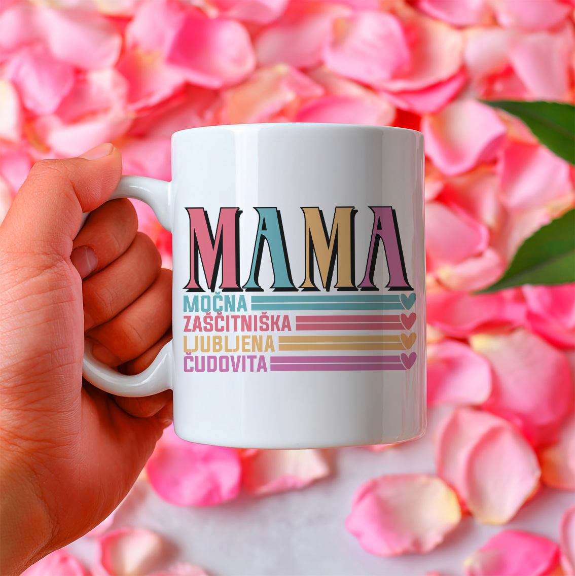 Z grafiko na sredini, kjer velik, barvit napis "MAMA" izstopa, spodaj pa sledi navdihujoč napis "MOČNA ZAŠČITNIŠKA LJUBLJENA ČUDOVITA". Pokažite svojo neomajno mamin duh z našo edinstveno šalico! Ta kakovostna keramična šalica prostornine 330 ml je popolna za mame, ki s ponosom nosijo svojo moč, ljubezen in edinstvenost. Motiv je natisnjen trpežno, da ostane lep tudi po mnogih pranjih v pomivalnem stroju, idealna pa je za jutranjo kavo, popoldanski čaj ali posebne trenutke z družino.