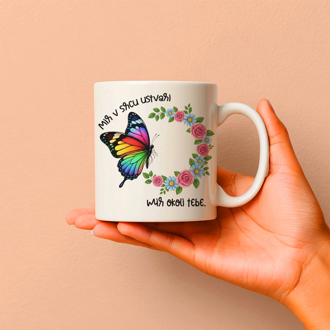 Keramična šalica z nežnim in globokim napisom "Mir v srcu ustvari mir okoli tebe", obdanem z velikim, elegantnim metuljem v osrednjem delu dizajna in nekaj manjšimi metuljčki okoli. Velik metulj simbolizira notranji mir in harmonijo, ki se nežno širi navzven, napis pa vas opominja, da pravi mir prihaja iz srca in vpliva na vse okoli vas.