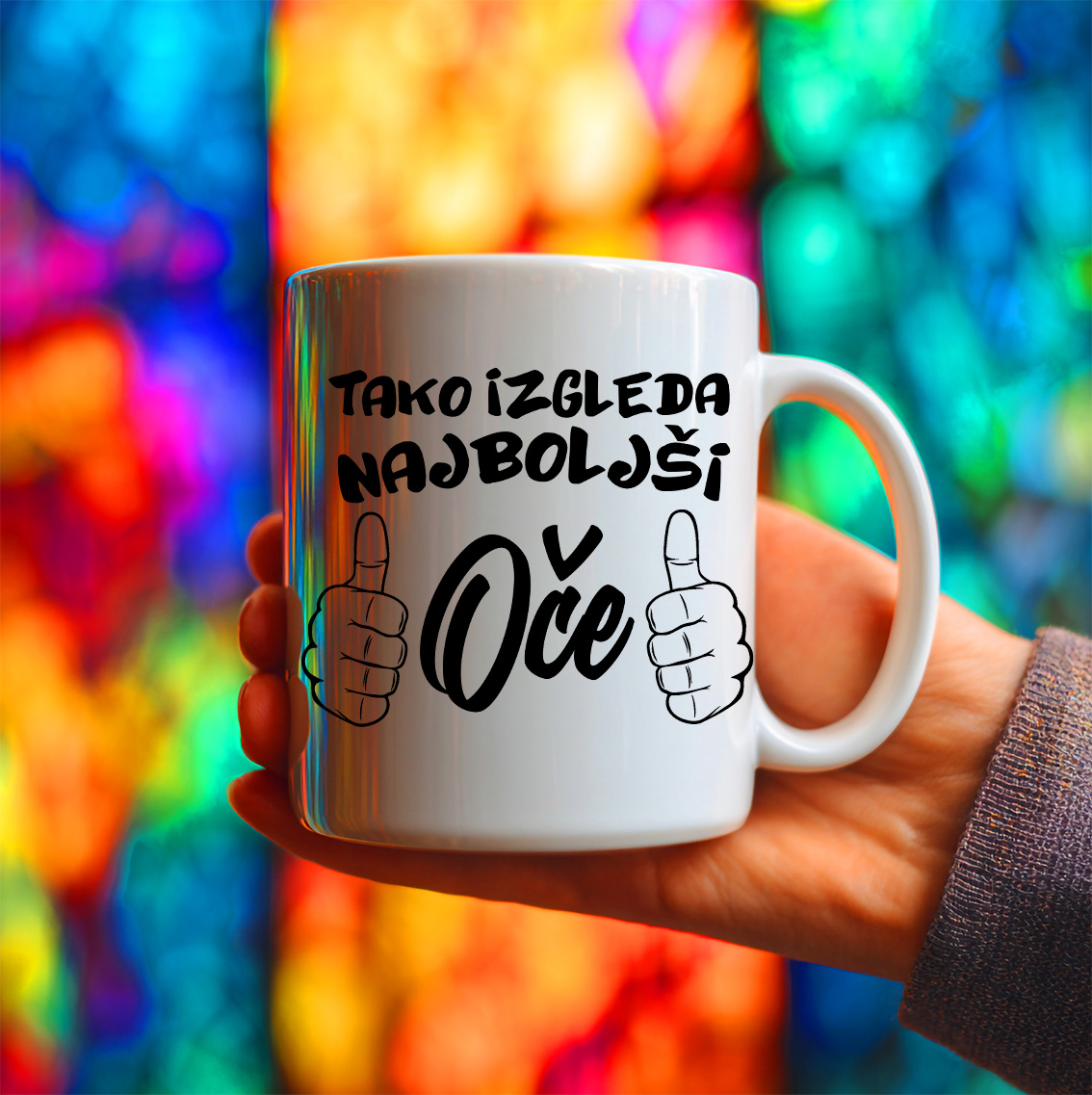 Z enobarvno grafiko na sredini, ki prikazuje palec, usmerjen proti obrazu, in drzen napis "NAJBOLJŠI OČE". Pokažite svetu, da ste oče, ki izstopa, z našo edinstveno šalico! Ta kakovostna keramična šalica prostornine 330 ml je idealna za očete, ki s ponosom nosijo svoj naslov in radi izražajo svojo samozavest z igrivim dizajnom. Motiv je natisnjen trpežno, da ostane lep tudi po mnogih pranjih v pomivalnem stroju, popolna pa je za jutranjo kavo, popoldanski čaj ali sproščena družinska srečanja.