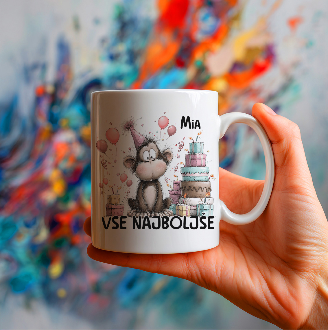 Keramična šalica z očarljivo barvno grafiko – prikupno sedečo banankico, ki zadovoljno sedi ob slastni torti s svečkami, obdano z nežnimi rozastimi dodatki in lebdečimi balončki, ki ustvarijo pravo rojstnodnevno vzdušje, na vrhu personaliziranim imenom (po vaših željah) in spodaj velikim napisom »Vse najboljše«.