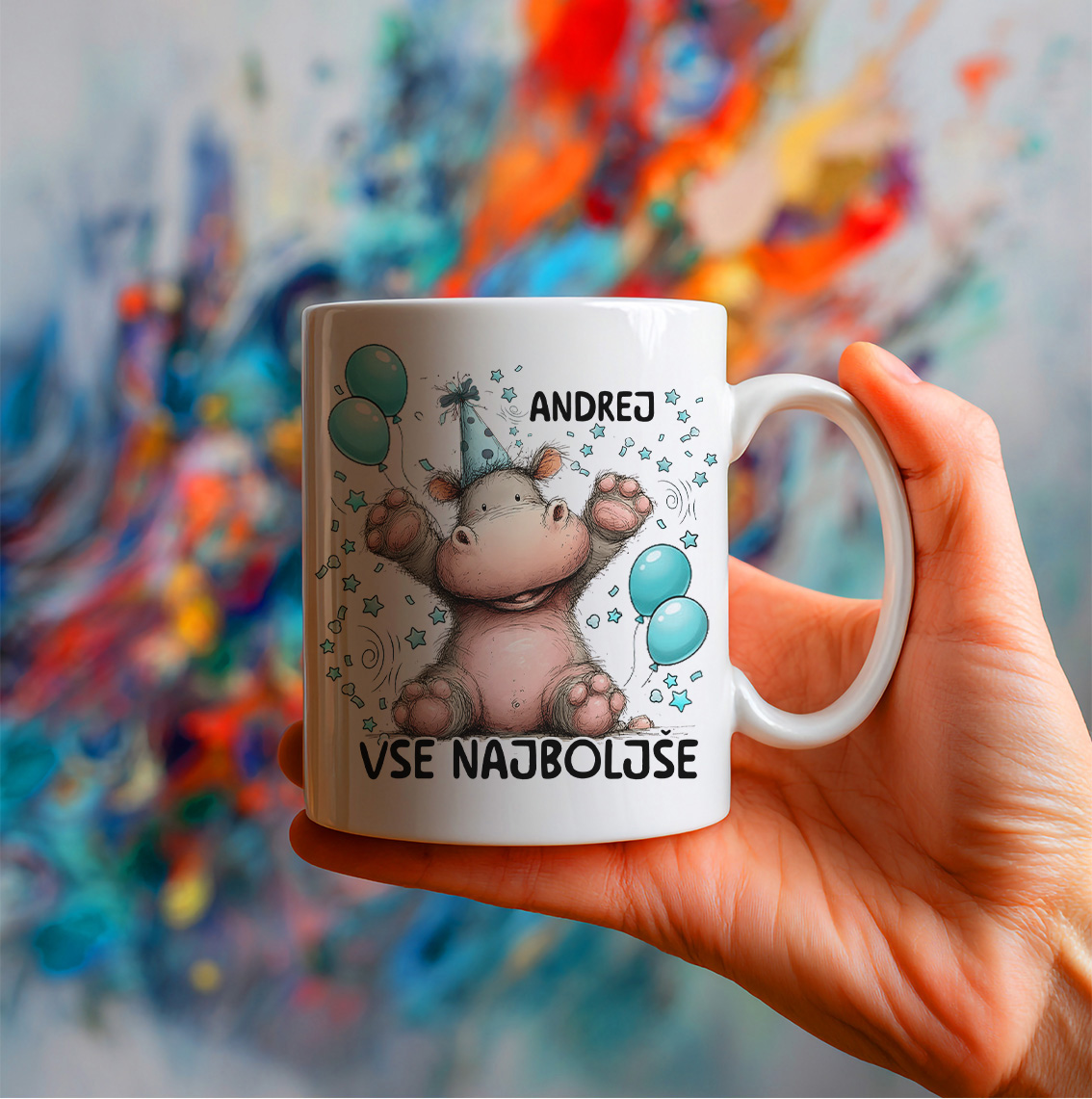 Keramična šalica s prelepo barvno grafiko – veseljem otroškim hipopotamom z dvignjenimi rokami, rojstnodnevnim klobučkom, balončki in zvezdicami v fantovski modri barvi, na vrhu personaliziranim imenom (po vaši želji) in spodaj velikim napisom »Vse najboljše«.