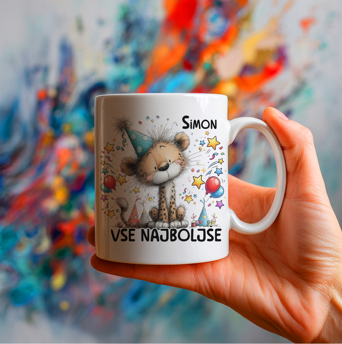 Keramična šalica s prelepo barvno grafiko – prikupnim levčkom, ki sedi z rojstnodnevnim klobučkom, vsebarvnim ozadjem, balončki okoli in raznoraznimi dodatki v mešanih barvah za fanta, na vrhu personaliziranim imenom (po vaših željah) in spodaj velikim napisom »Vse najboljše«.