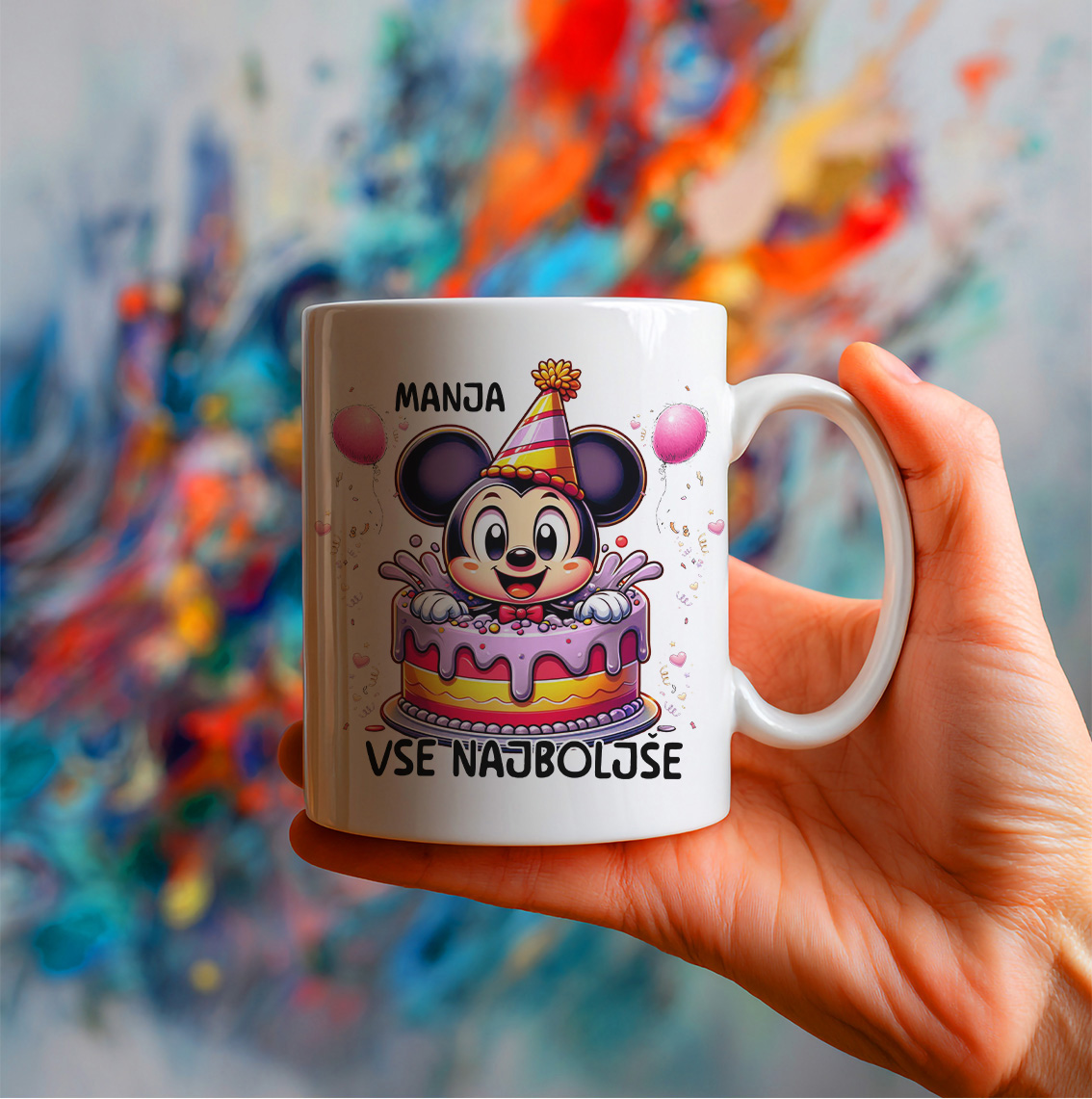Keramična šalica s prikupno miško – nasmejano in razposajeno miško z velikimi ušesi, ki radovedno gleda iz velike rojstnodnevne torte, na glavi barvni klobuček, okoli pa nežni roza dodatki in pisani balončki v punčastih odtenkih, ob njej pa velik napis »Vse najboljše« (z možnostjo dodajanja imena!).
