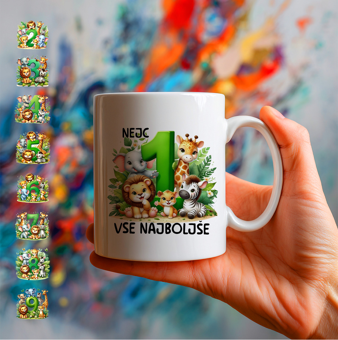 Keramična šalica s prelepo safari grafiko – otroškimi živalcami v razposajeni družbi, lepim ozadjem tropskih rastlin, na sredini pa velika številka starosti (od 1 do 9 let), ob njej pa velik napis »Vse najboljše« (z možnostjo dodajanja imena in izbrane številke!).