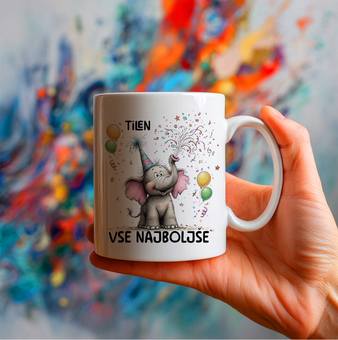 Keramična šalica z očarljivo barvno grafiko – mladim razposajenim slončkom, ki veselo piha iz rilca pisane dodatke in balone, obdanim z živahnimi večbarvnimi elementi, ki ustvarijo pravo rojstnodnevno vzdušje, na vrhu personaliziranim imenom (po vaših željah) in spodaj velikim napisom »Vse najboljše«.