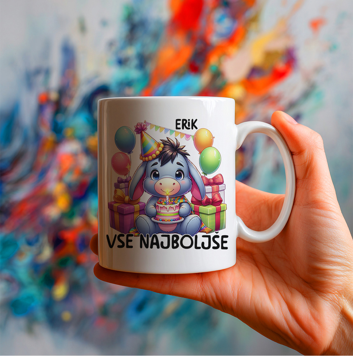 Keramična šalica s prikupnim slončkom – otroškim in nasmejanim sedečim slončkom z barvastim rojstnodnevnim klobučkom, ki v tačkah drži slastno torto s svečkami, obdan z darili in pisano množico balončkov v večbarvnih odtenkih, ob njem pa velik napis »Vse najboljše« (z možnostjo dodajanja imena!).