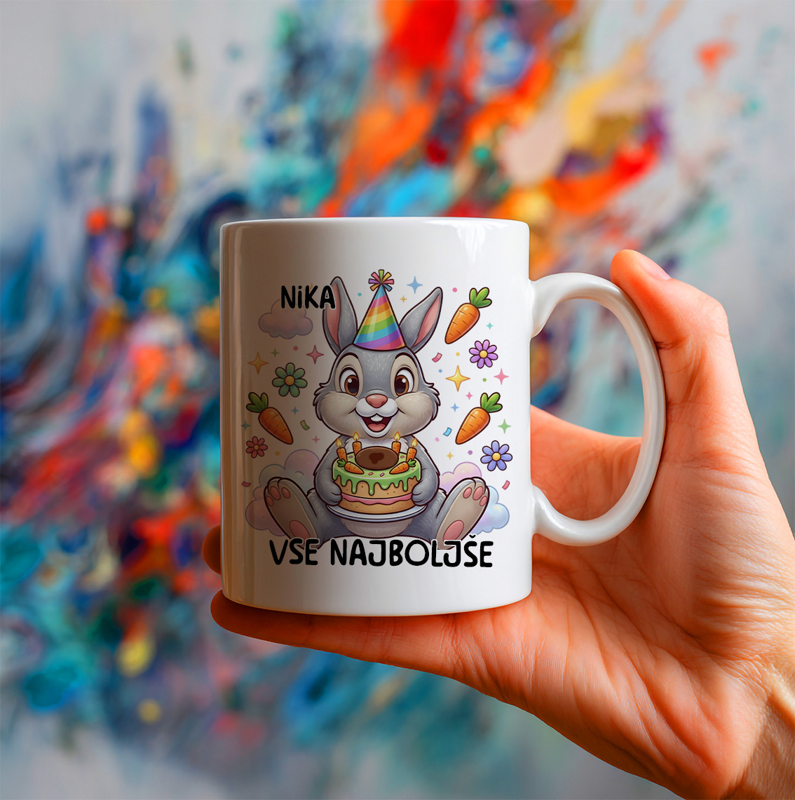 Keramična šalica s prikupnim zajčkom – nežnim in nasmejanim z velikimi ušesi, ki v tačkah drži slastno rojstnodnevno torto, na glavi barvni klobuček, okoli pa korenčki, rožice in puhasti oblački v punčastih barvah, ob njem pa velik napis »Vse najboljše« (z možnostjo dodajanja imena!).