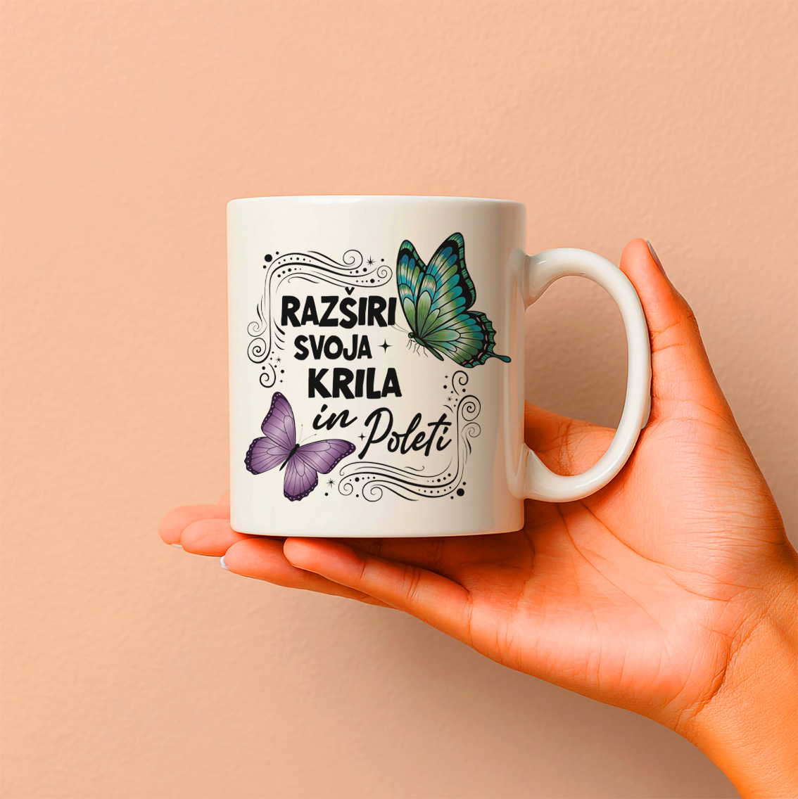 Zakaj izbrati to šalico? Ni samo posoda za napitek – je vsakodnevni opomnik, da razširite krila in poletite proti svojim sanjam. Dva metulja v lepi grafiki dodata občutek ravnotežja, elegance in moči, napis pa vas napolni z energijo za velike korake. Popolna za vse, ki verjamejo v osebno rast in želijo živeti brez omejitev.