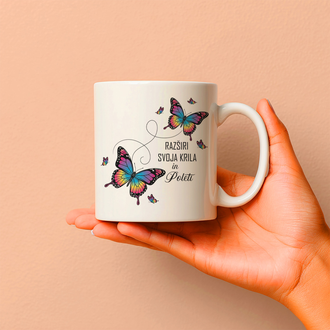 Zakaj izbrati to šalico? Ni samo posoda za napitek – je vsakodnevni opomnik, da razširite krila in poletite proti svojim sanjam. Dva metulja v lepi grafiki dodata občutek ravnotežja, elegance in moči, napis pa vas napolni z energijo za velike korake. Popolna za vse, ki verjamejo v osebno rast in želijo živeti brez omejitev.